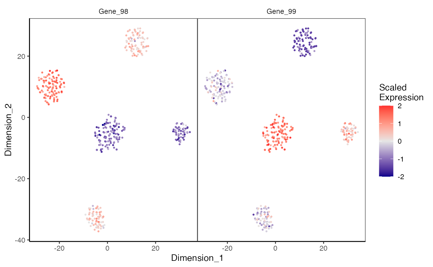data(sceCeldaCG) sce <- celdaTsne(sceCeldaCG) plotDimReduceFeature(x = sce, reducedDimName = "celda_tSNE", normalize = TRUE, features = c("Gene_98", "Gene_99"), exactMatch = TRUE)library(SingleCellExperiment) data(sceCeldaCG) sce <- celdaTsne(sceCeldaCG) plotDimReduceFeature(x = counts(sce), dim1 = reducedDim(altExp(sce), "celda_tSNE")[, 1], dim2 = reducedDim(altExp(sce), "celda_tSNE")[, 2], normalize = TRUE, features = c("Gene_98", "Gene_99"), exactMatch = TRUE)