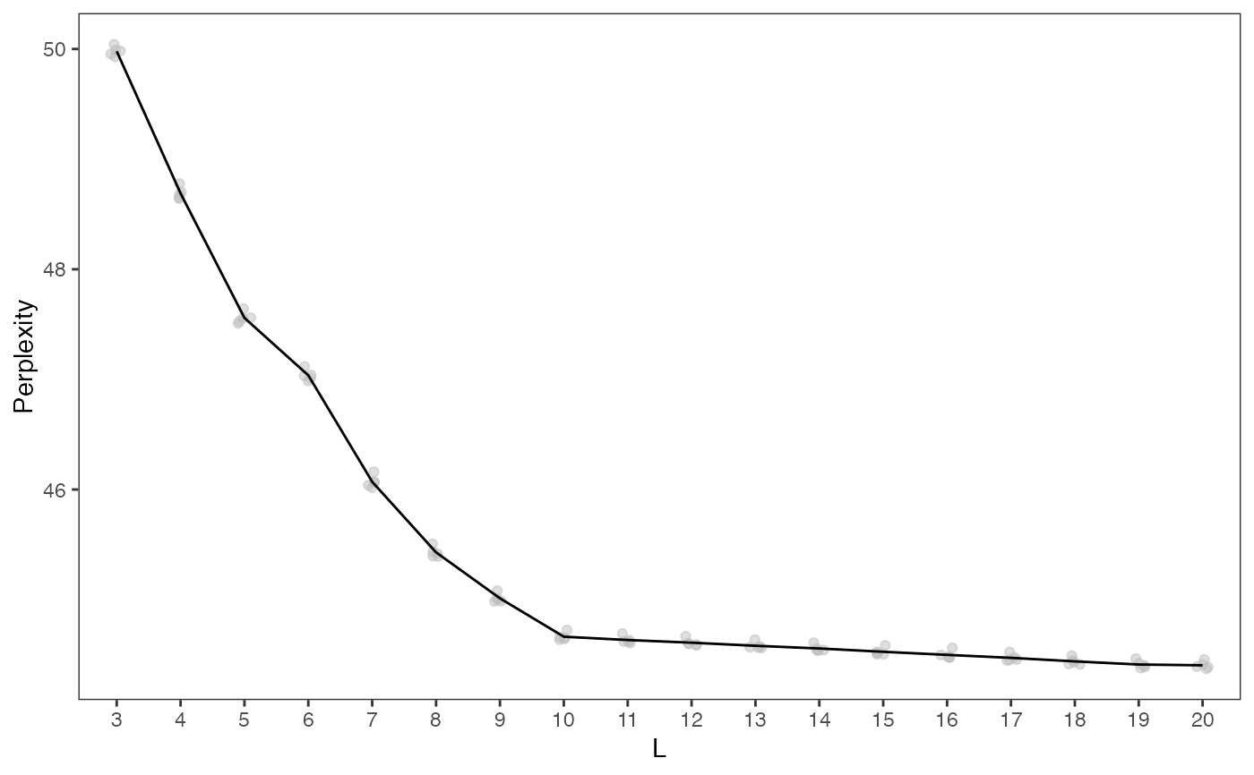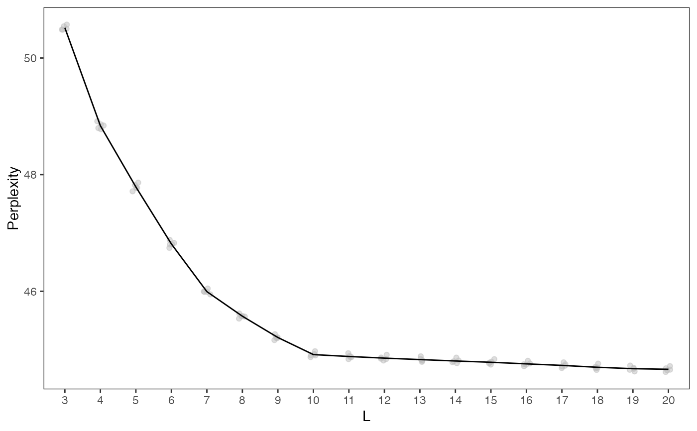 | perplexity | Logical. Whether to calculate perplexity for each model. If FALSE, then perplexity can be calculated later with resamplePerplexity. Default TRUE. |