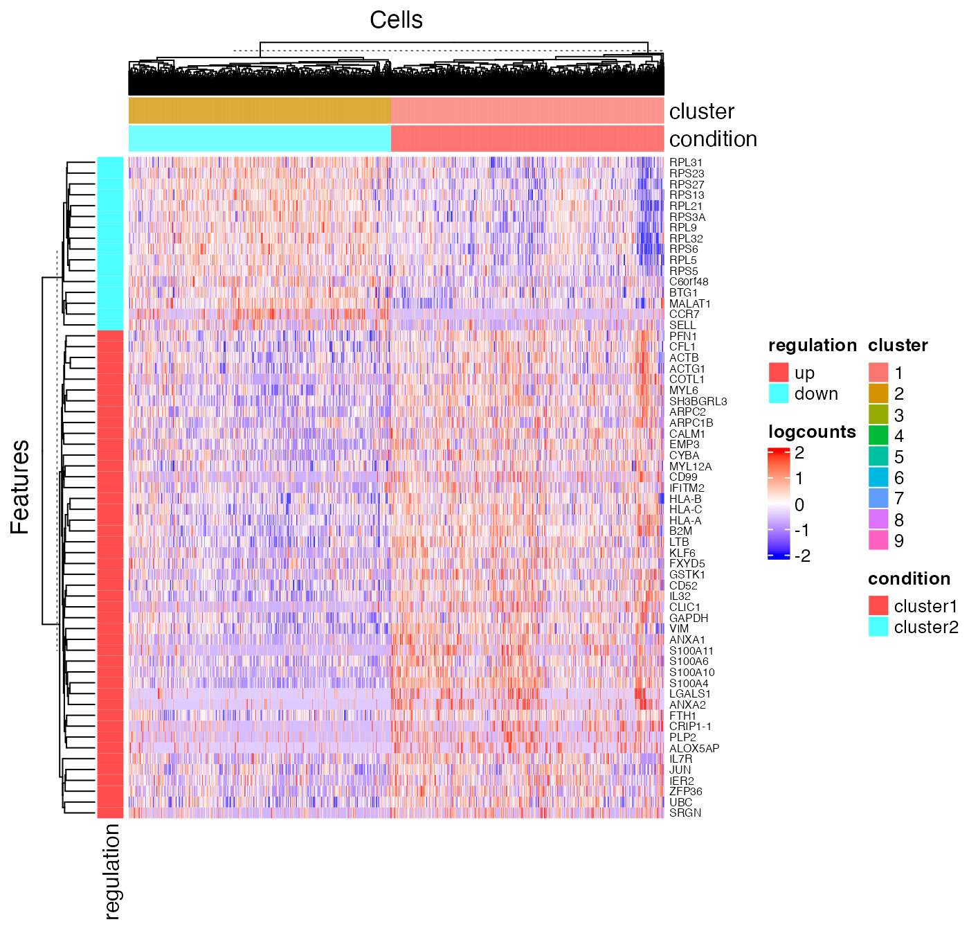 analysisName = "cluster1_VS_2")Similarly to the marker detection section, SCTK also has a DE analysis specific heatmap plotting function, plotDEGHeatmap(). Here, users can just easily enter the analysisName specified for one run and the function will automatically arrange the output. The heatmap is also splitted into a “checker board”, by the “conditions” (i.e. the groups selected when running runDEAnalysis()) and the “regulation” (i.e. “up” if the log2 fold change is positive in “group1” against “group2”).