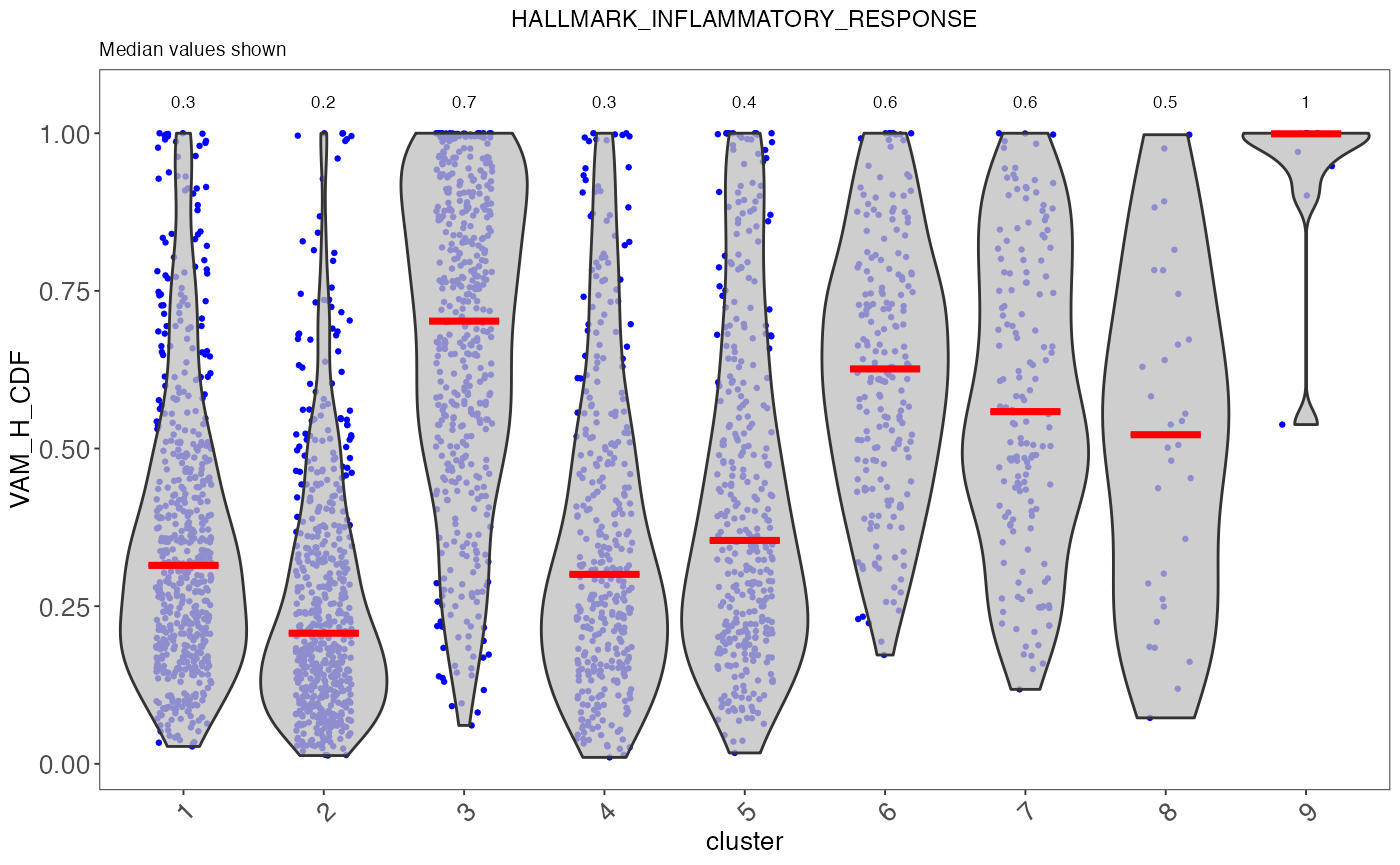 plotPathway(sce, resultName = "VAM_H_CDF", geneset = hallmark, groupBy = "cluster")