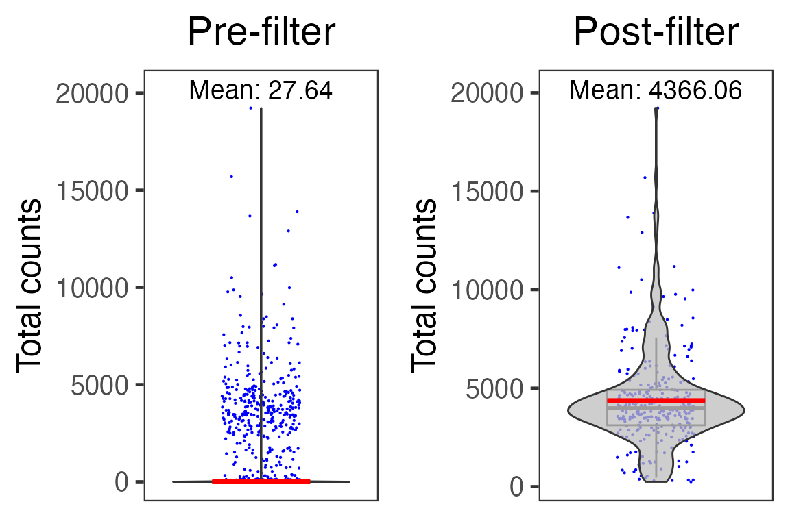 We can compare the average total UMI counts per cell before and after cell filtration: