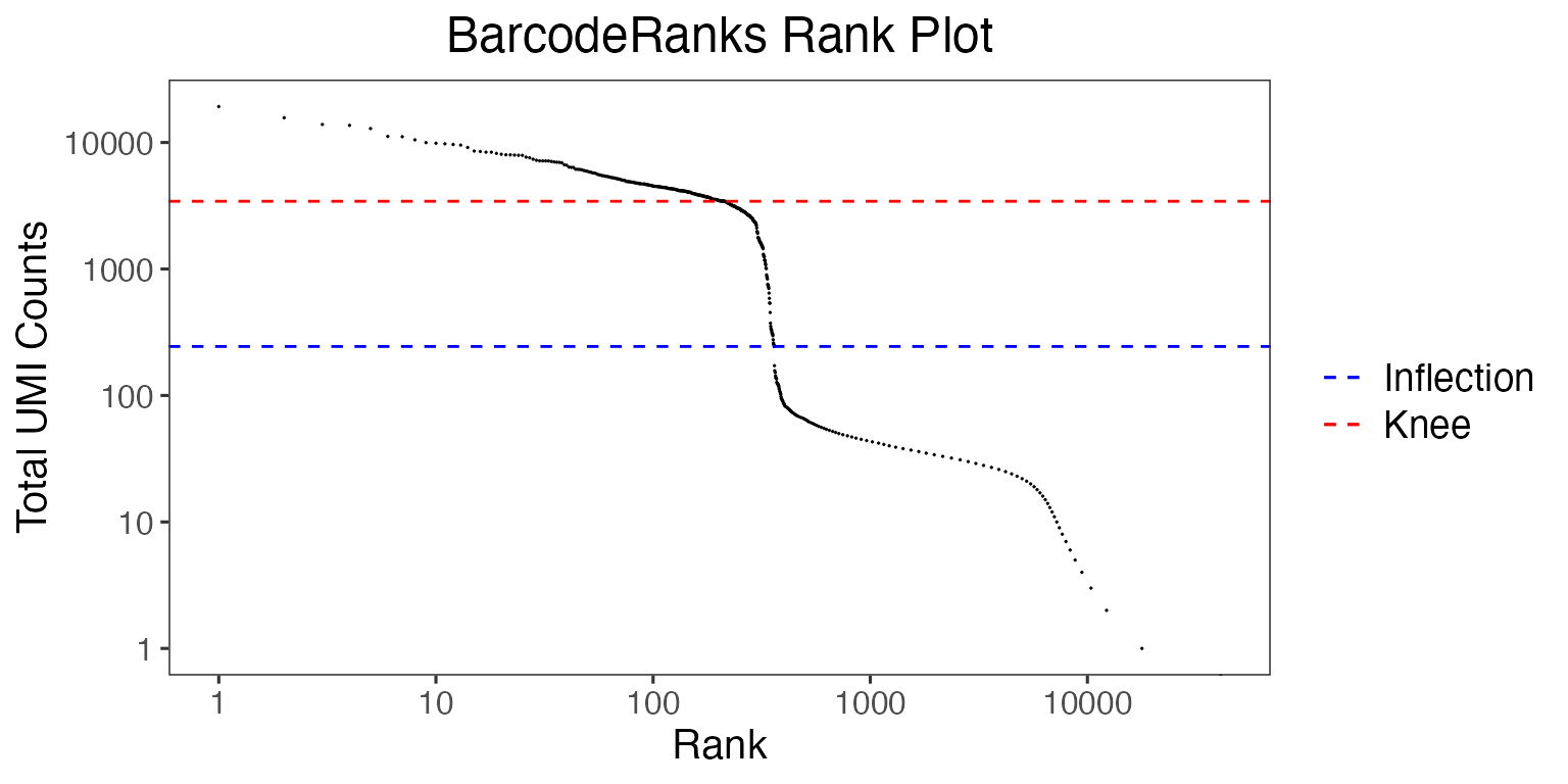 The total UMI count of each barcode is plotted against its rank. We can see a steep dropoff of UMI counts around the inflection point, where we see a presumed separation between cell-containing and empty droplets.