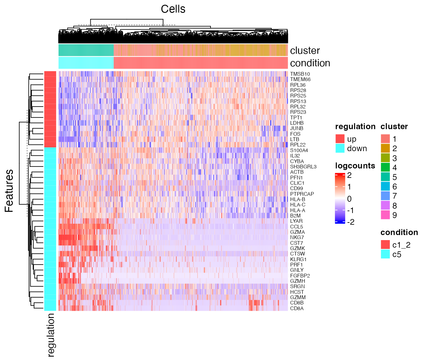 plotDEGHeatmap(sce, useResult = "c1_2_VS_c5", log2fcThreshold = .5)