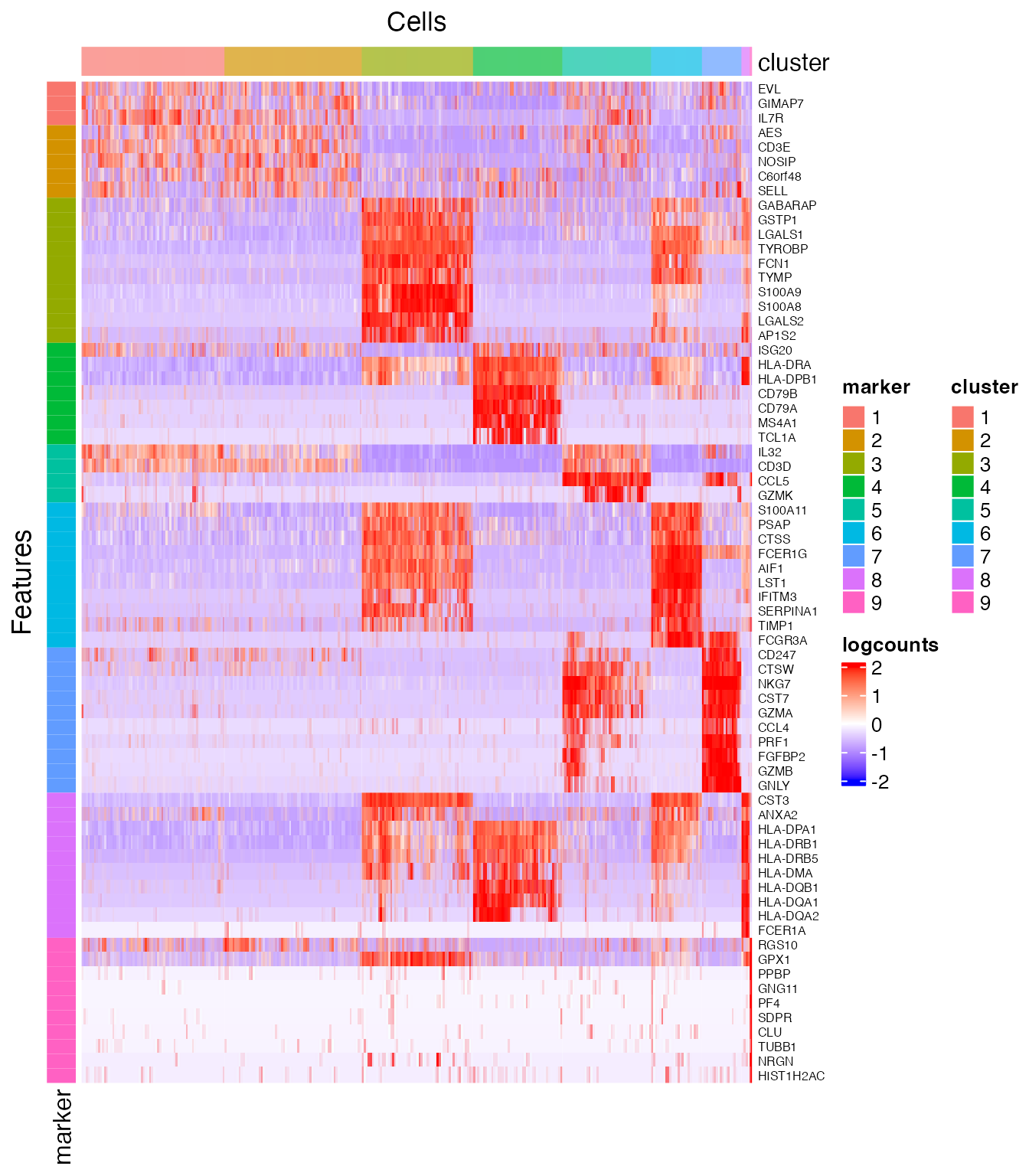 sce <- runFindMarker(inSCE = sce, useAssay = "logcounts", cluster = "cluster")Results