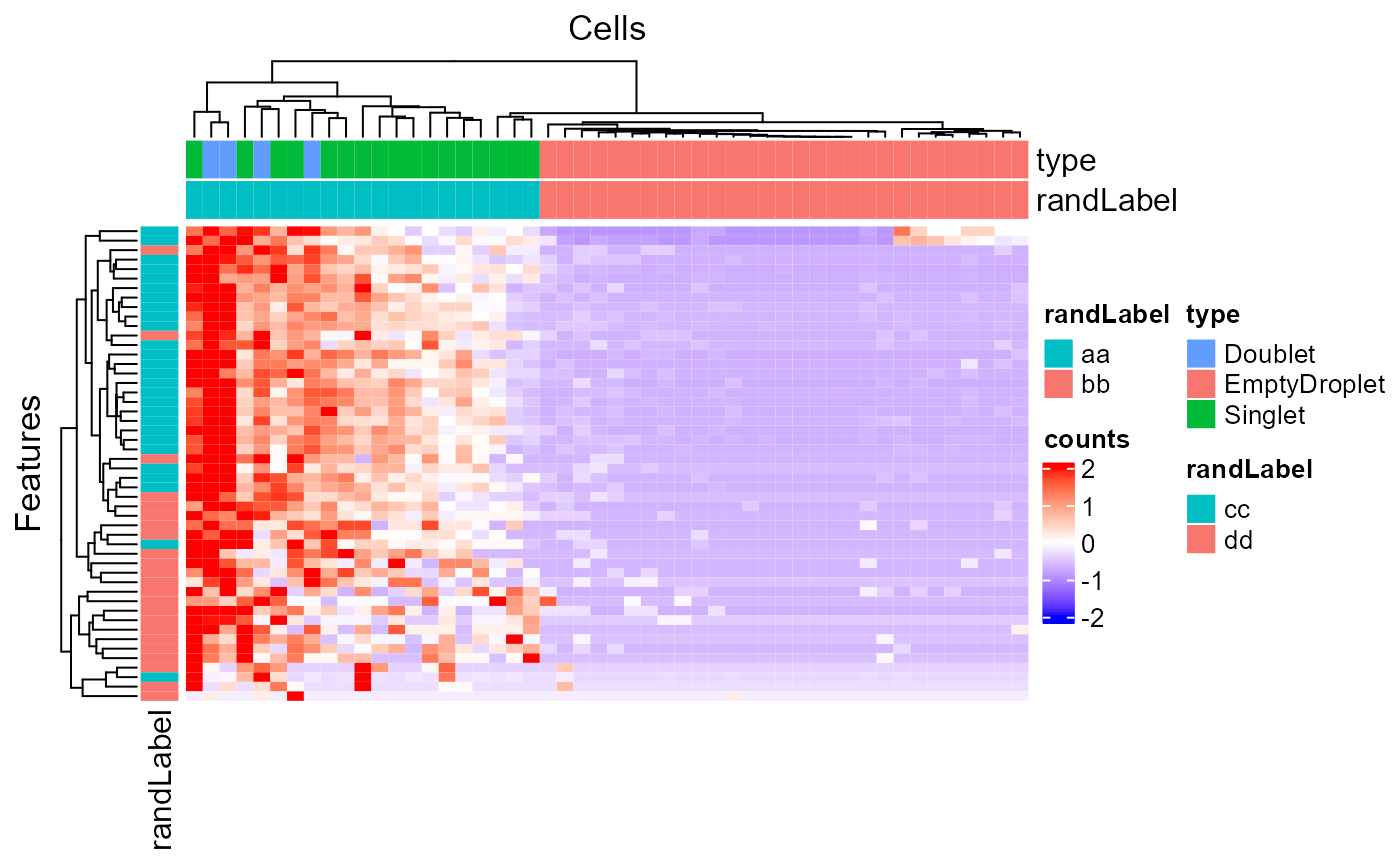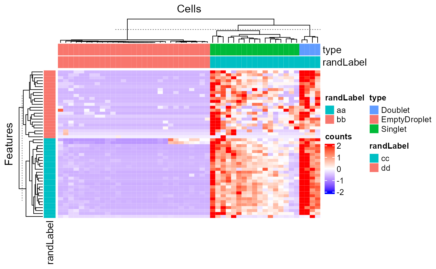 plotSCEHeatmap(inSCE = sce, useAssay = "counts", featureIndex = featureSubset, cellIndex = cellSubset, rowDataName = "randLabel", colDataName = c("type", "randLabel"))## dimnames(.) <- NULL translated to