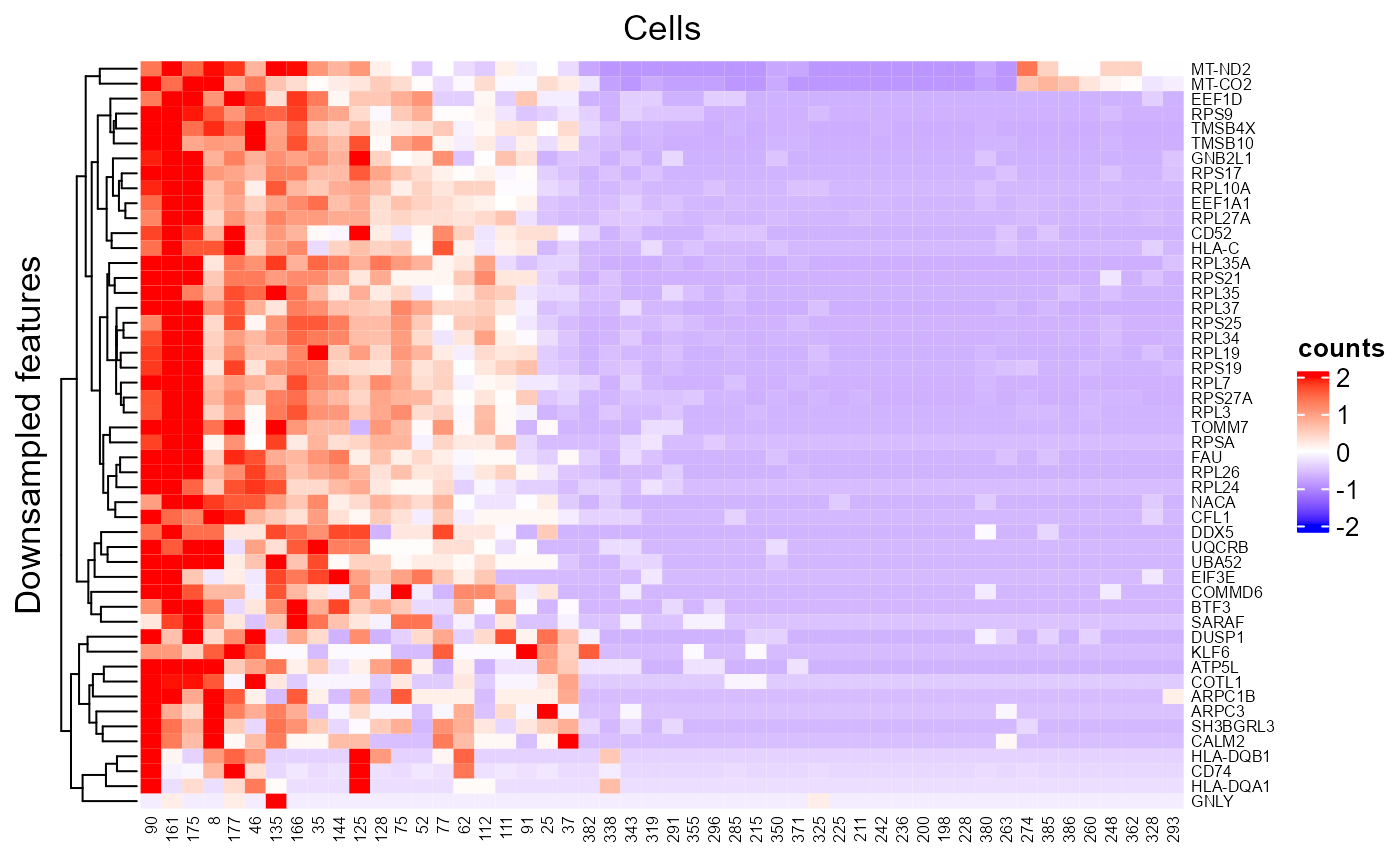 plotSCEHeatmap(inSCE = sce, useAssay = "counts", featureIndex = featureSubset, cellIndex = cellSubset, rowLabel = "feature_name", colLabel = seq(ncol(sce)), colDend = FALSE, rowTitle = "Downsampled features")