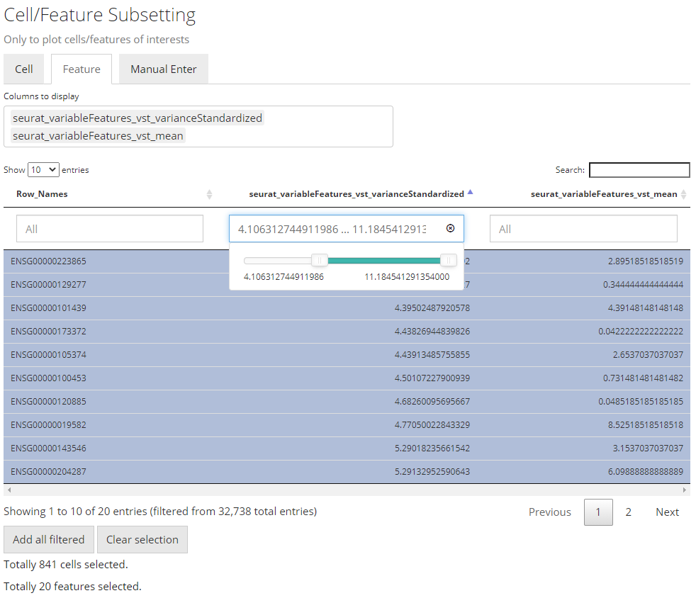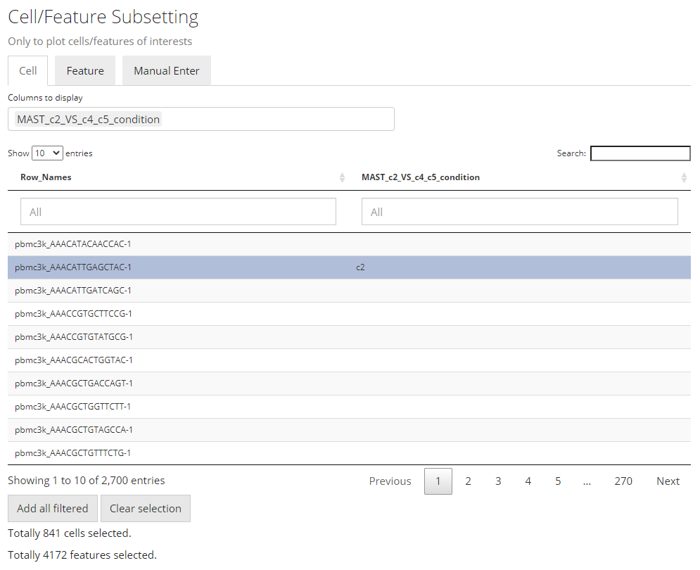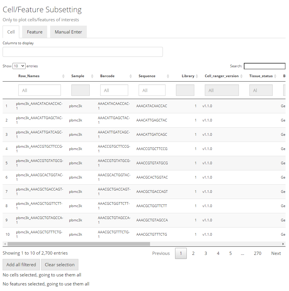 Generally, to make a selection, users will first find the annotations which can define the cells or features of interests, apply the filter, and then press “Add all filtered” to finish the selection. When there is no applicable annotation, we also allow manually entering a list of cell/feature identifiers to specify the contents to be plotted.