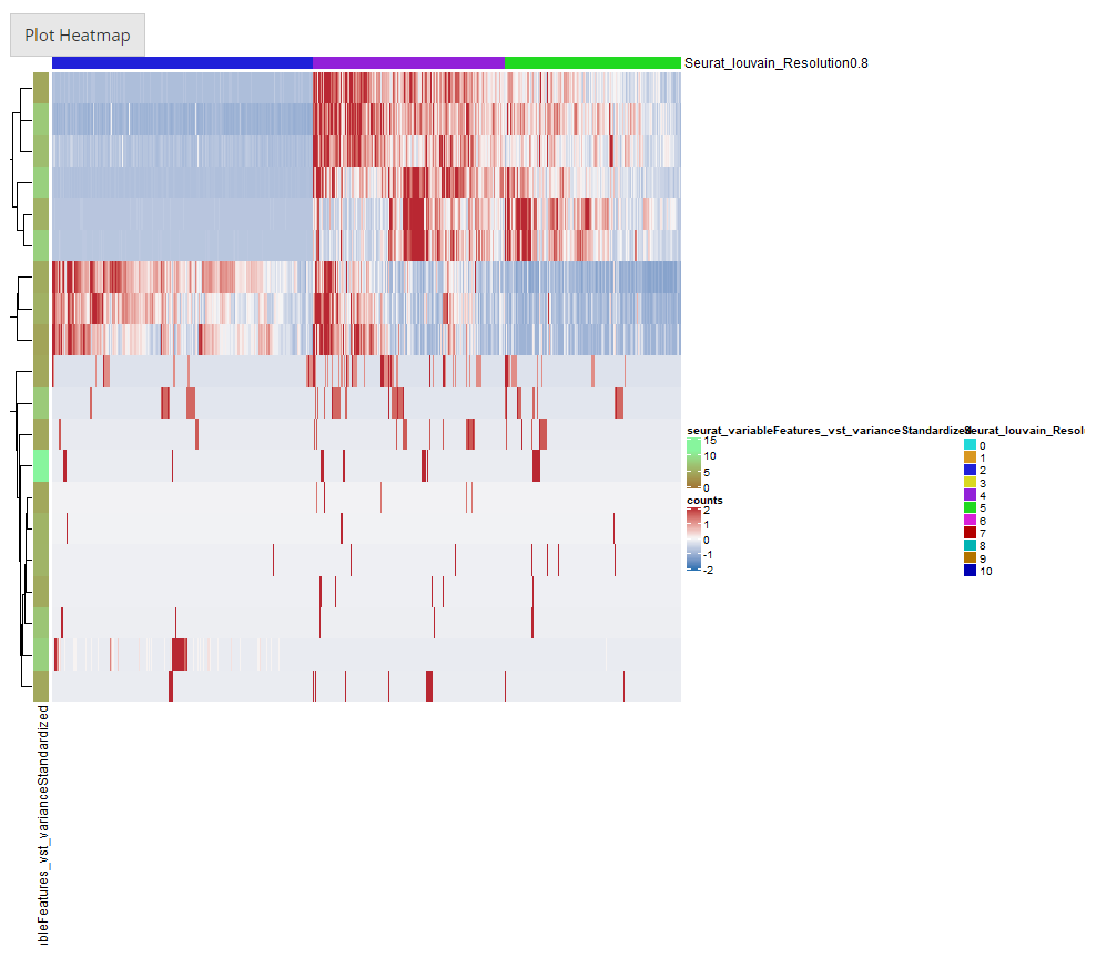 The data used for plotting a heatmap can only be a feature expression matrix, technically called assay in R language. This will be set at the selection input “Assay to Plot”.