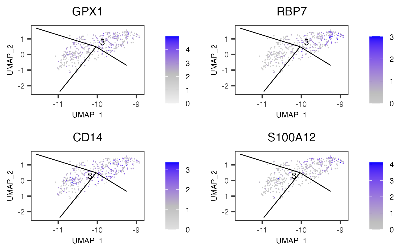 plotTSCANClusterDEG(sce, useCluster = 3, pathIndex = 6, useReducedDim = "UMAP", topN = 4)