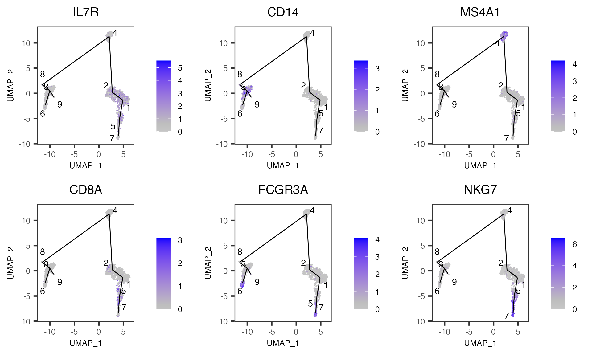 plotTSCANDimReduceFeatures(sce, c("IL7R", "CD14", "MS4A1", "CD8A", "FCGR3A", "NKG7"))