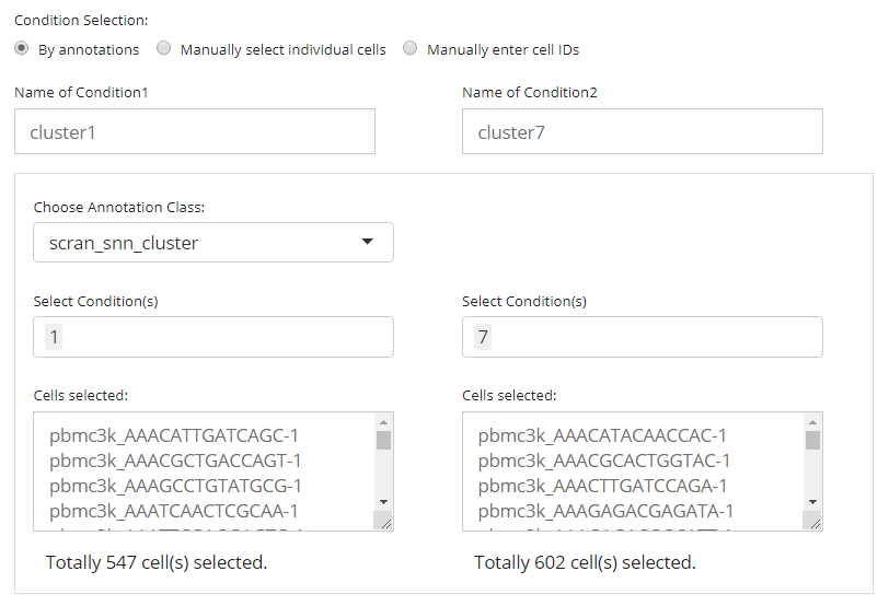 First, users need to choose one single option from the selection list “Choose Annotation Class”. Then, in the UI, there will be two columns for each condition. For each of them, users can make selections for which categories should belong to the condition, at the selection input “Select Condition(s)”. One or more selections are acceptable. When selections are made for one condition while no selection for the other, all the categories but those already used for the former will go to the latter. The text boxes, “Cells selected”, are only for showing users what are selected. While the text span below the boxes summaries the total number of cells selected.