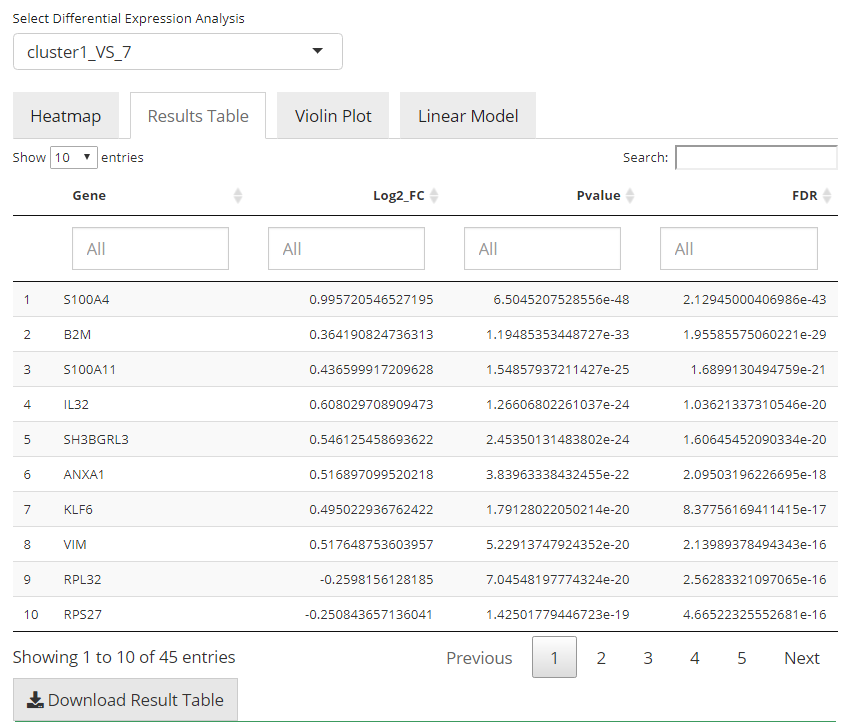 In this tab, there will be a table with all the genes that are thought to be differentially expressed in the condition of interest against the condition of control, with high significance and passed all filter parameters. The gene names (default identifier in the background object, not necessarily a gene symbol), p-values, log2FC values, and FDR values will be present. The table will be saved in background by the name of the analysis, entered before running. Users can also download the table in comma separated value (CSV) format, by clicking “Download Result Table” button.