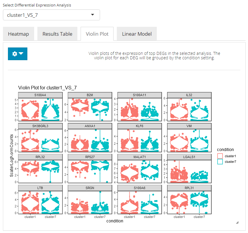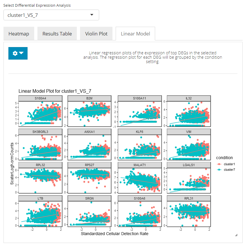 In the linear modeling plot tab, an analysis of covariance (ANCOVA) is done, showing how expression differs in the top N selected genes between cells in both conditions. Users can set the number of top DEG to plot and the feature identifier type to display, by clicking on the blue settings (cog) button.