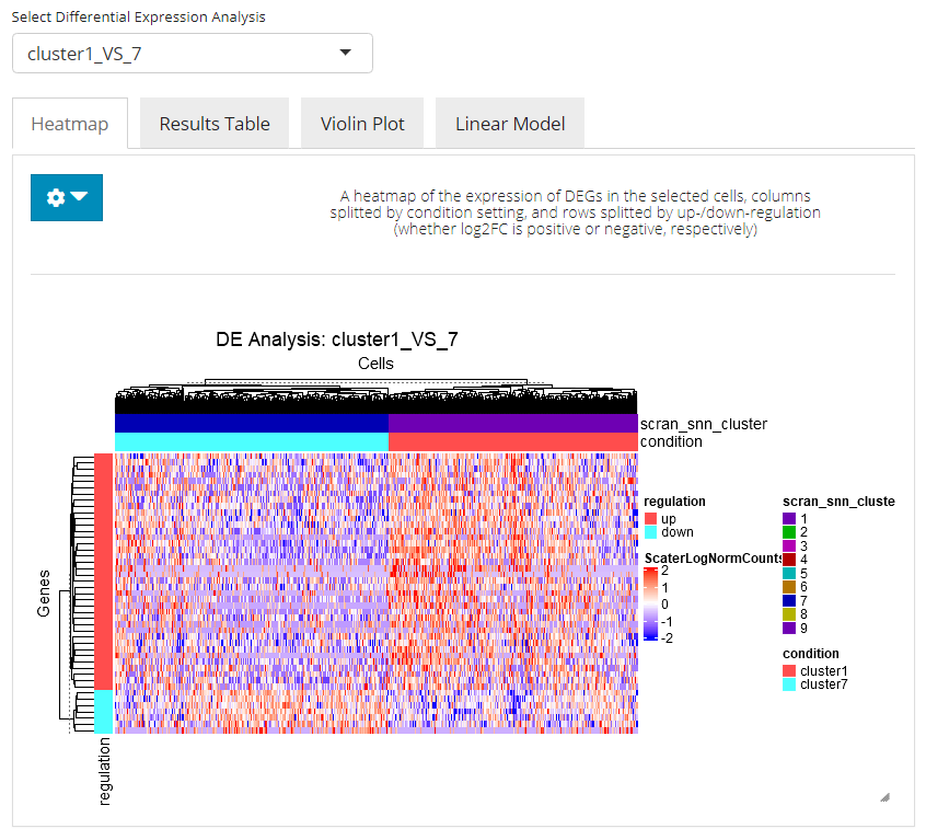 This tab enables a heatmap visualization for the DE analysis selected. Here SCTK will automatically group the involved cells to the two conditions where they are assigned to, and group the genes by the log2FC values, which indicate whether a gene is up-regulated or down-regulated. Additional settings can be applied by clicking on the blue settings (cog) button.