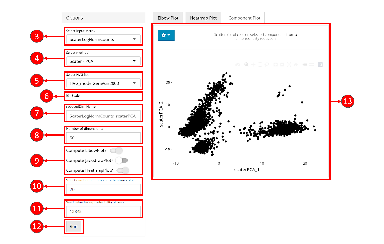 In general, the UI offers options for selection of data items and choice of parameters on the left side, and a visualization panel on the right side of the interface. A detailed workflow guide to run and visualize dimension reduction (DR) is described below: