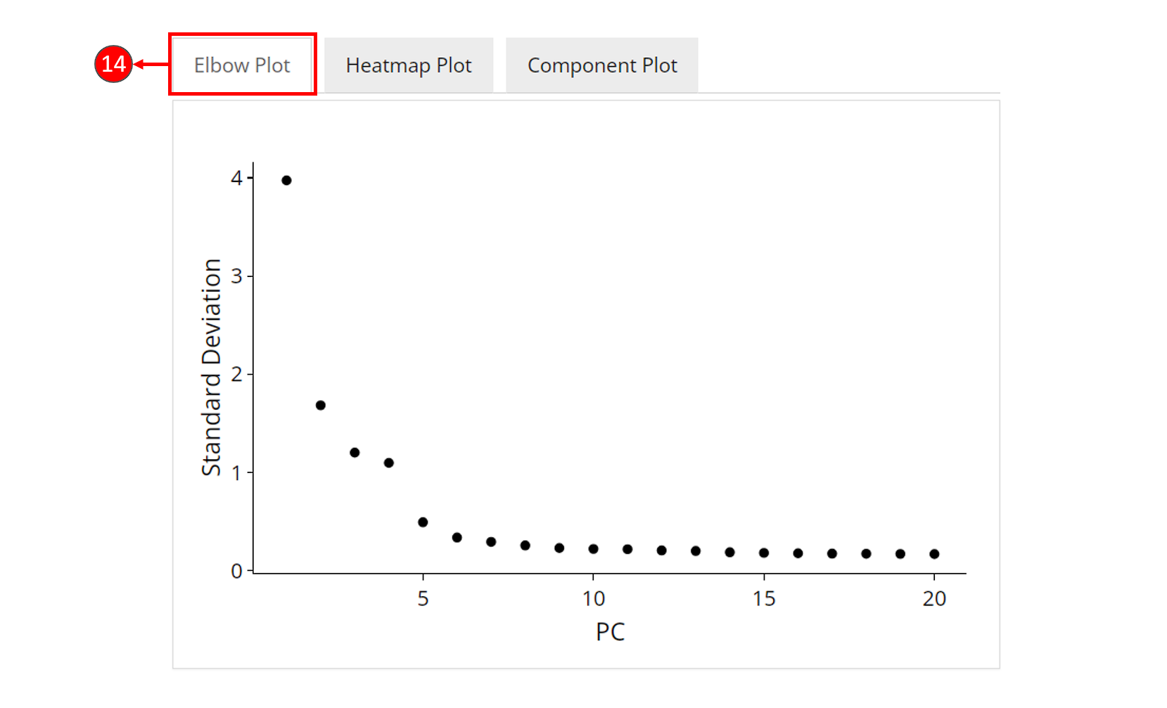 reducedDimName = "scaterPCA")| Method | 2-Dimensional Component Plot | Elbow Plot | JackStraw Plot | Heatmap Plot |