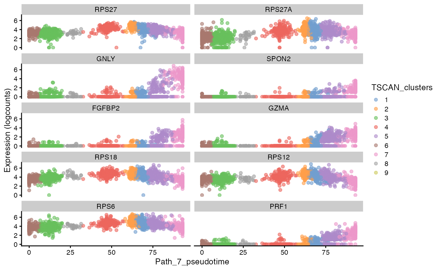 sce <- runTSCANDEG(sce, pathIndex = 7, useAssay = "logcounts")Two visualization methods are provided. One is a heatmap of the expression of features significantly changed on the path of interest, in the cells involved in this path. Another groups scatter plots of cells with top feature expression change along the path.