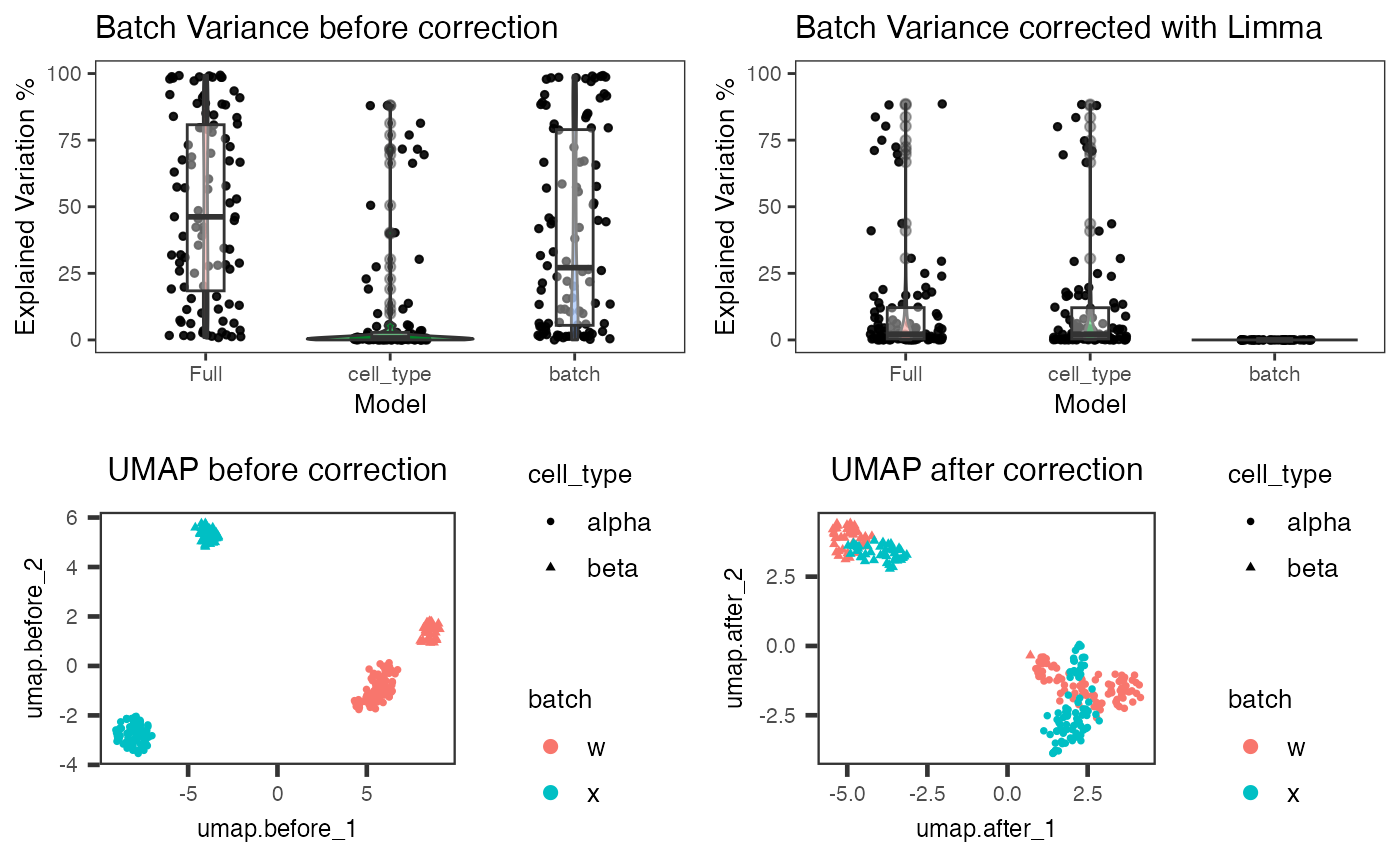 plotBatchCorrCompare(sceBatches, "LIMMA", condition = "cell_type")
