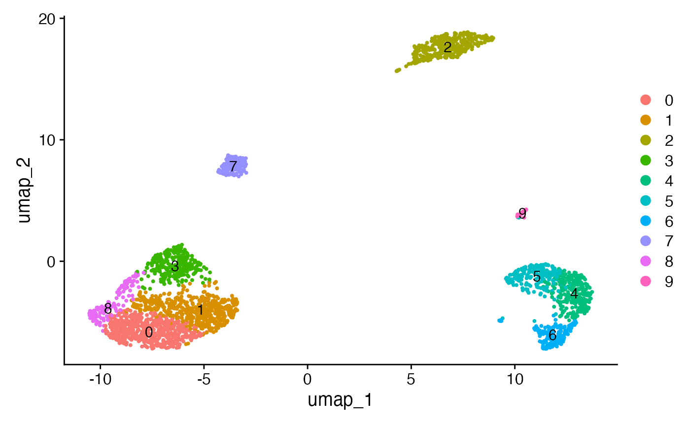 sce <- runSeuratFindClusters(inSCE = sce, useReduction = "pca", resolution = 0.8, algorithm = "louvain", dims = 10)