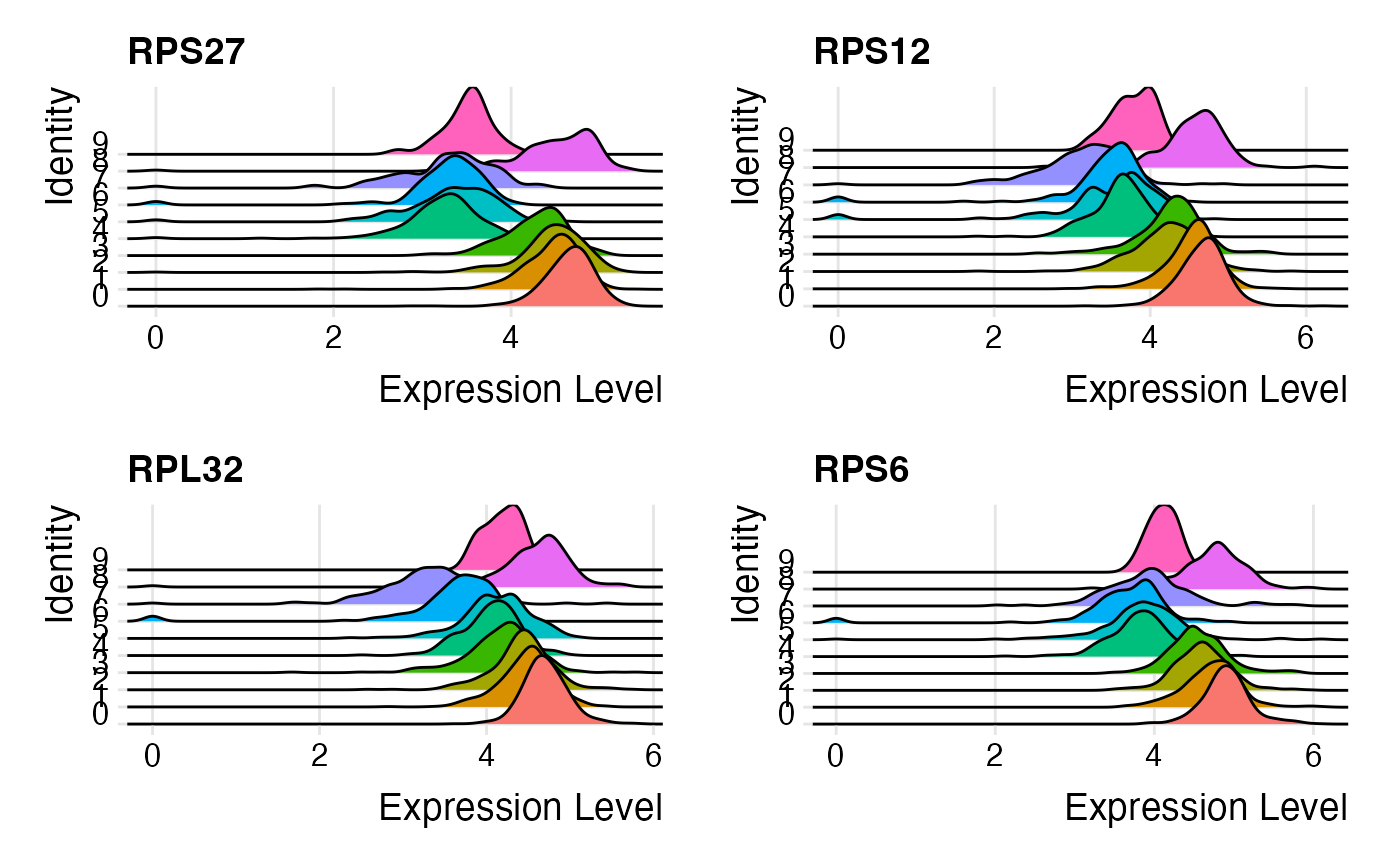 plotSeuratGenes(inSCE = sce, useAssay = "seuratNormData", plotType = "ridge", features = metadata(sce)[["seuratMarkers"]]$gene.id[1:4], groupVariable = "Seurat_louvain_Resolution0.8", ncol = 2, combine = TRUE)