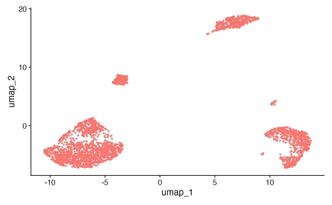 sce <- runSeuratUMAP(inSCE = sce, useReduction = "pca", reducedDimName = "seuratUMAP", dims = 10, minDist = 0.3, nNeighbors = 30, spread = 1, seed = 42)