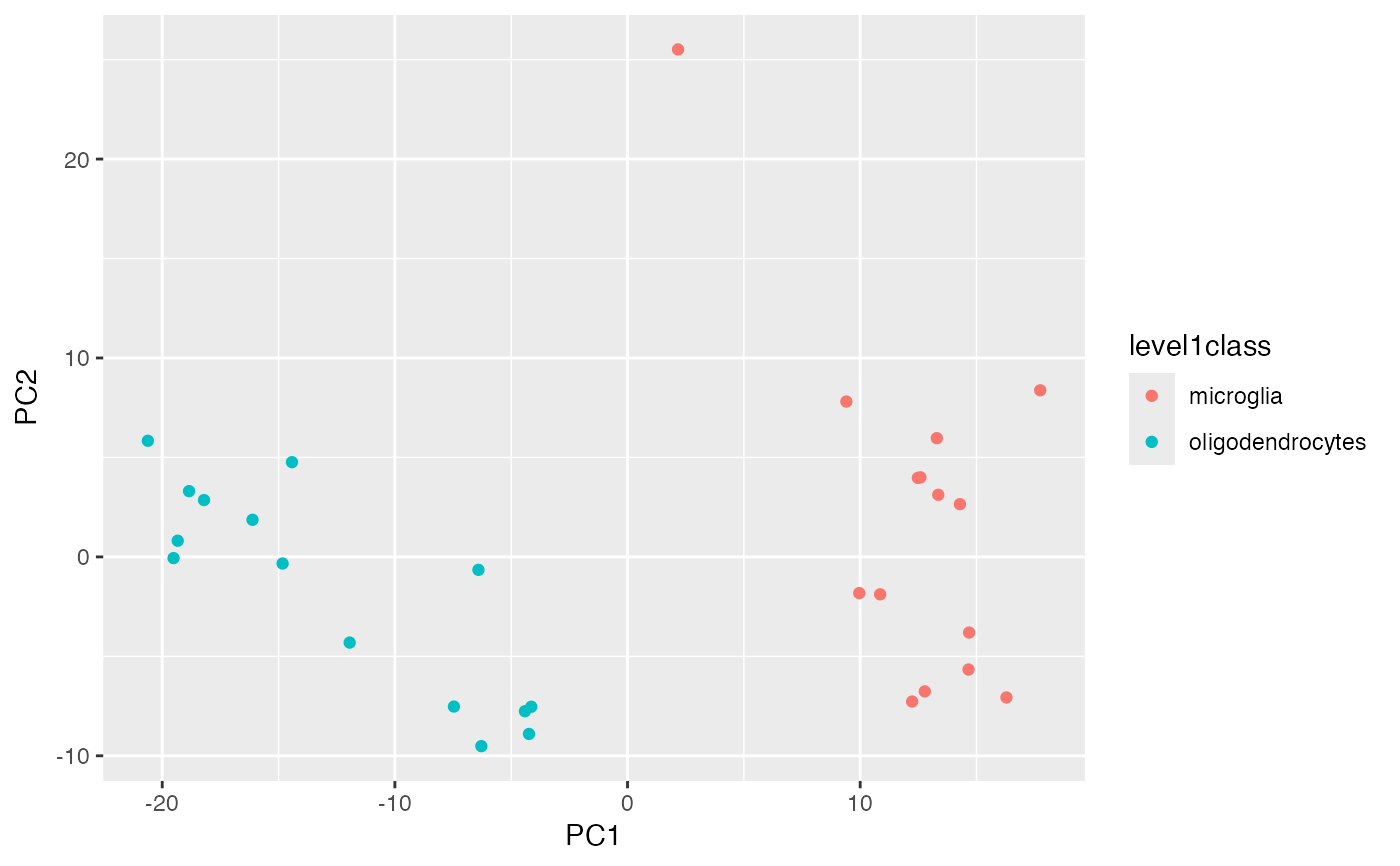 plotPCA(mouseBrainSubsetSCE, colorBy = "level1class",