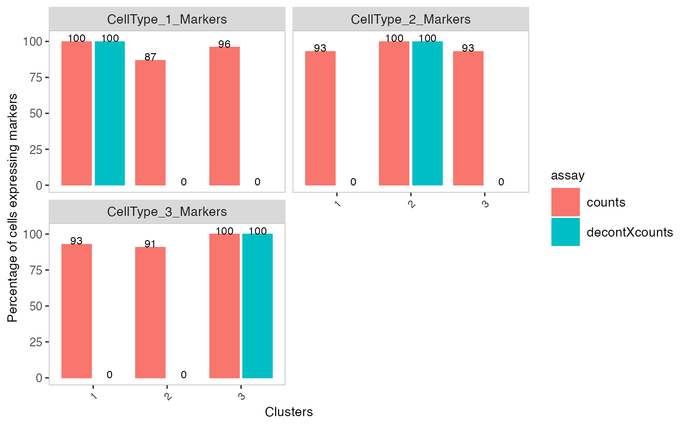 # Generate matrix with contamination s <- simulateContamination(seed = 12345) library(SingleCellExperiment)#>#>#>#> #>#> #> #> #> #> #> #> #> #> #> #> #> #> #> #> #> #>#>#>#>#>#> #>#> #> #> #> #>#> #> #>#> #> #> #> #> #> #> #>#>#> #>#> #> #>#> #> #>#>#>#>#> #> #> #> #>#> #>#> #> #>#> #> #>#>#>#>#>#>#>#>#>#>#>#>#># Plot decontX cluster labels umap <- reducedDim(sce) plotDimReduceCluster(x = sce$decontX_clusters, dim1 = umap[, 1], dim2 = umap[, 2], )# Plot percentage of marker genes detected # in each cell cluster before decontamination s$markers#> $CellType_1_Markers #> [1] "Gene_47" "Gene_32" "Gene_86" #> #> $CellType_2_Markers #> [1] "Gene_70" "Gene_33" "Gene_48" #> #> $CellType_3_Markers #> [1] "Gene_74" "Gene_26" "Gene_20" #># Plot percentage of marker genes detected # in each cell cluster after contamination plotDecontXMarkerPercentage(sce, markers = s$markers, assayName = "decontXcounts")# Plot percentage of marker genes detected in each cell # comparing original and decontaminated counts side-by-side plotDecontXMarkerPercentage(sce, markers = s$markers, assayName = c("counts", "decontXcounts"))# Plot raw counts of indiviual markers genes before # and after decontamination plotDecontXMarkerExpression(sce, unlist(s$markers))