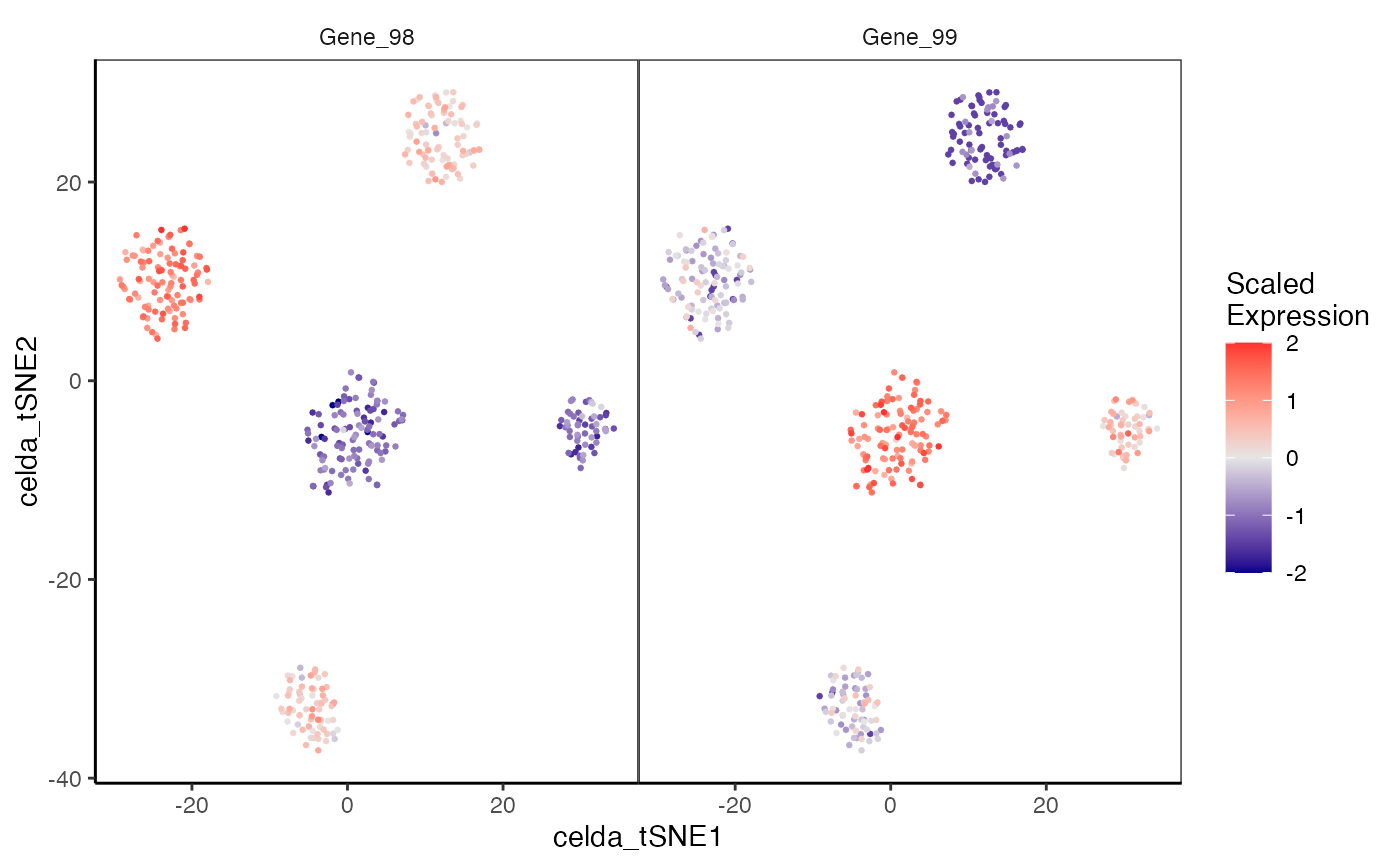 data(sceCeldaCG) sce <- celdaTsne(sceCeldaCG) plotDimReduceFeature(x = sce, reducedDimName = "celda_tSNE", normalize = TRUE, features = c("Gene_98", "Gene_99"), exactMatch = TRUE)library(SingleCellExperiment) data(sceCeldaCG) sce <- celdaTsne(sceCeldaCG) plotDimReduceFeature(x = counts(sce), dim1 = reducedDim(altExp(sce), "celda_tSNE")[, 1], dim2 = reducedDim(altExp(sce), "celda_tSNE")[, 2], normalize = TRUE, features = c("Gene_98", "Gene_99"), exactMatch = TRUE)