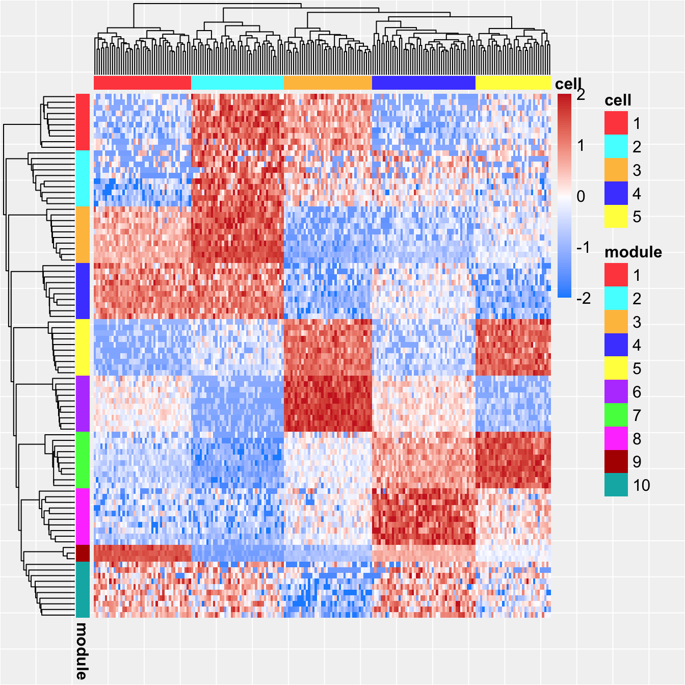 The clustering results can be viewed with a heatmap of the normalized counts using the function celdaHeatmap. The top nfeatures in each module will be selected according to the factorized module probability matrix.