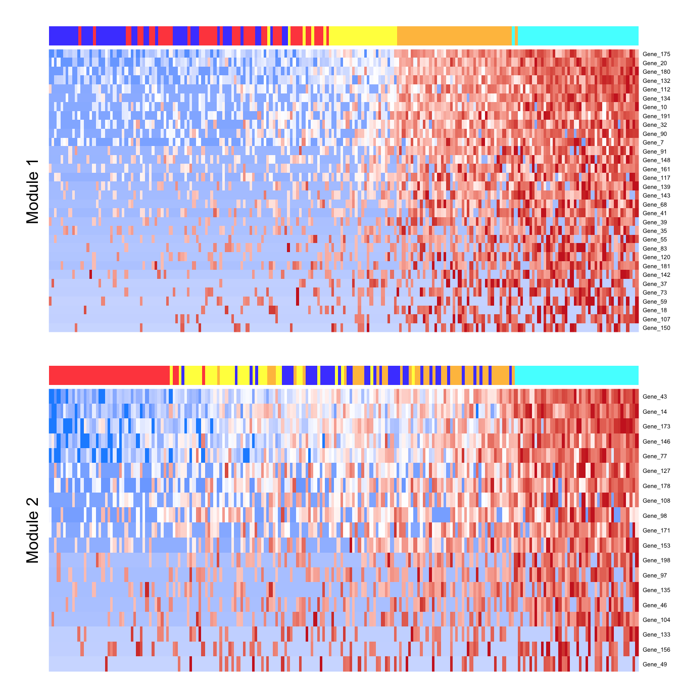 moduleHeatmap(sce, featureModule = c(1,2), topCells = 100)