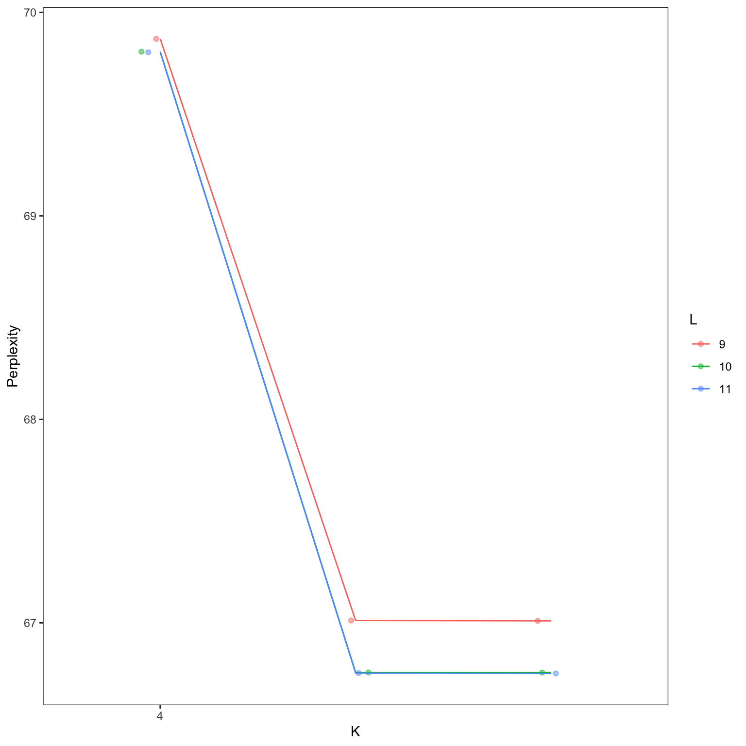 In this example, the perplexity for L stops decreasing at L = 10 for the majority of K values. For the line corresponding to L = 10, the perplexity stops decreasing at K = 5. Thus L = 10 and K = 5 would be a good choice. Again, manual review of specific selections of K is often be required to ensure results are biologically coherent.