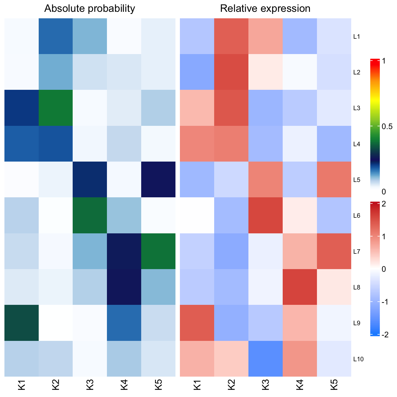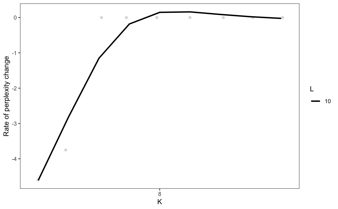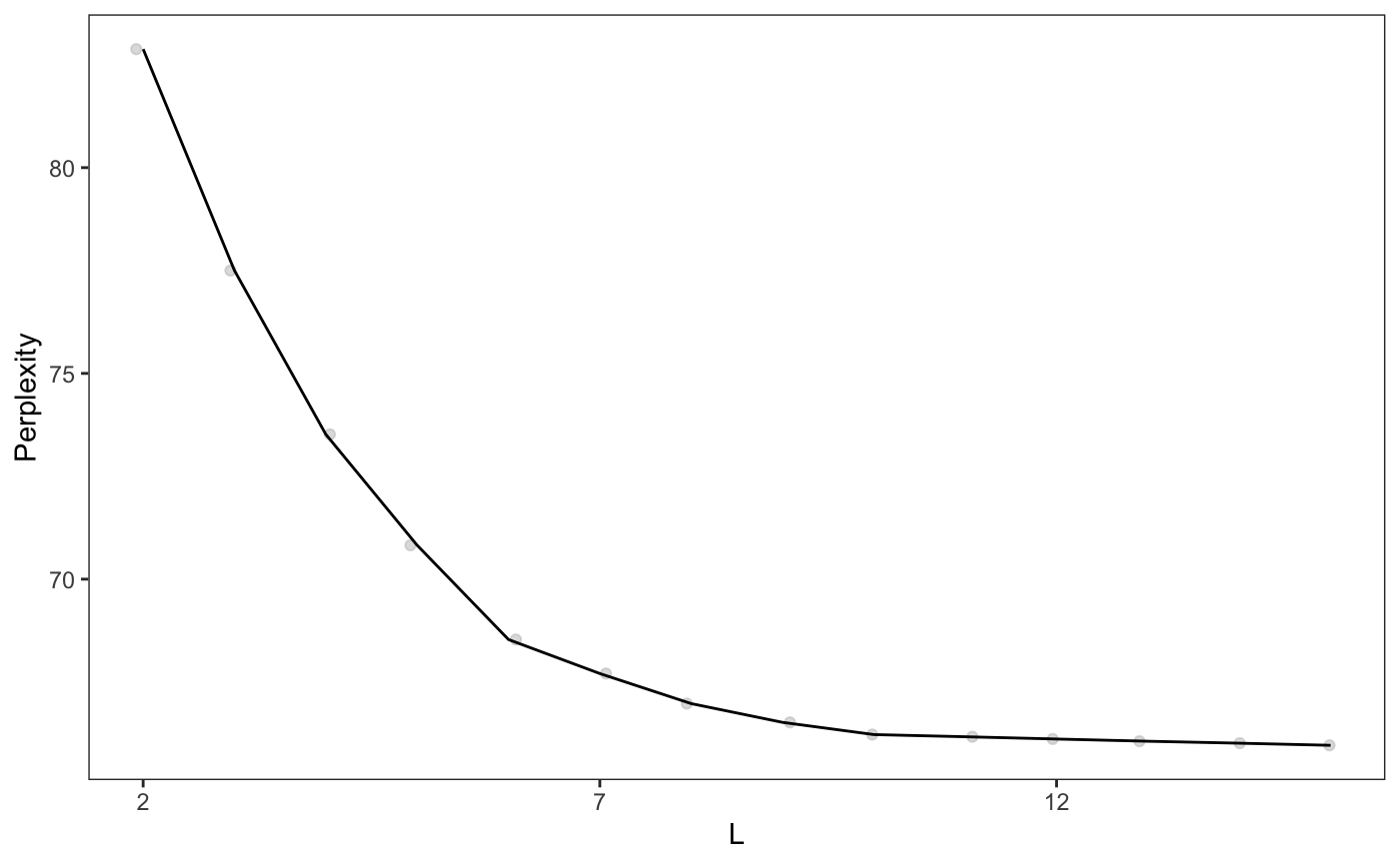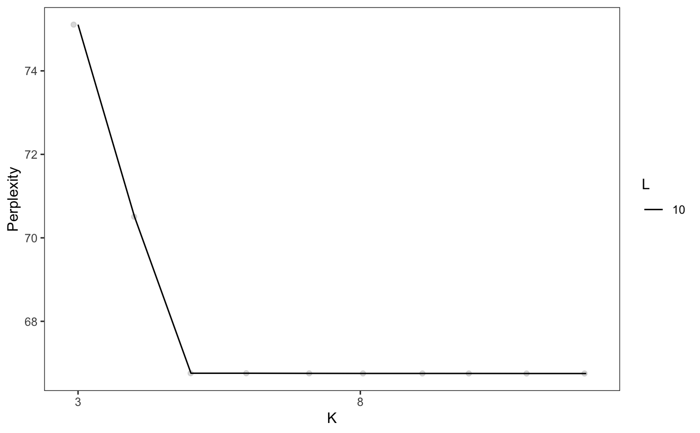 In this plot, the perplexity for K stops decreasing at K = 5, with a final K/L combination of K = 5, L = 10. Generally, this method can be used to pick a reasonable L and a potential range of K. However, manual review of specific selections of K is often required to ensure results are biologically coherent.