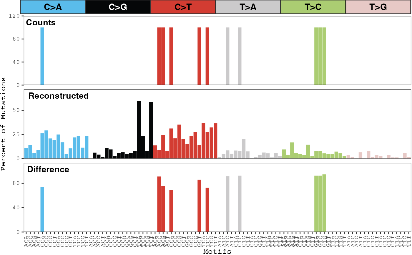 Displays the observed distribution of counts for each mutation type, the distribution of reconstructed counts for each mutation type using the inferred mutational signatures, and the difference between the two distributions.