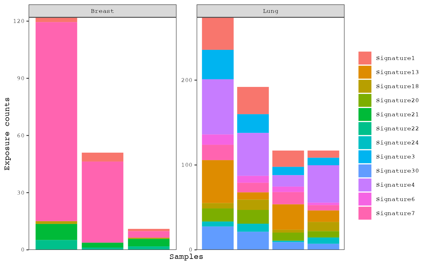 data(musica_annot) data(cosmic_v2_sigs) grid <- auto_predict_grid(musica_annot, "SBS96", cosmic_v2_sigs, "lda", "Tumor_Subtypes", combine_res = FALSE) #> Lung #> Breast combined <- combine_predict_grid(grid, musica_annot, "SBS96", cosmic_v2_sigs) plot_exposures(combined, group_by = "annotation", annotation="Tumor_Subtypes")![]()
