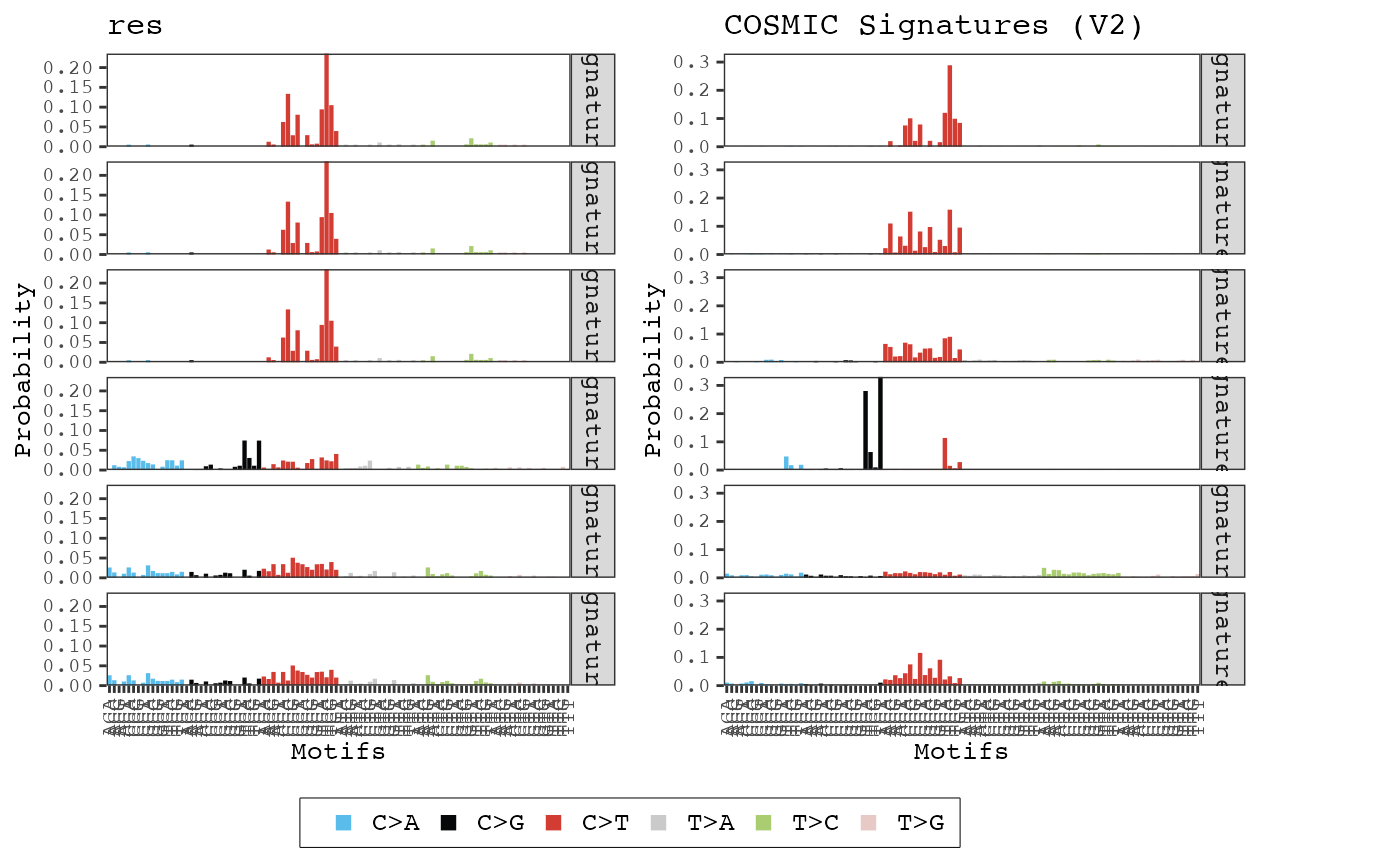 data(res) compare_cosmic_v2(res, threshold = 0.7)#> cosine x_sig_index y_sig_index x_sig_name y_sig_name #> 4 0.9742418 3 7 Signature3 Signature7 #> 5 0.7730161 3 11 Signature3 Signature11 #> 6 0.7568463 3 30 Signature3 Signature30 #> 1 0.7337470 1 13 Signature1 Signature13 #> 2 0.7296889 2 5 Signature2 Signature5 #> 3 0.7107142 2 19 Signature2 Signature19