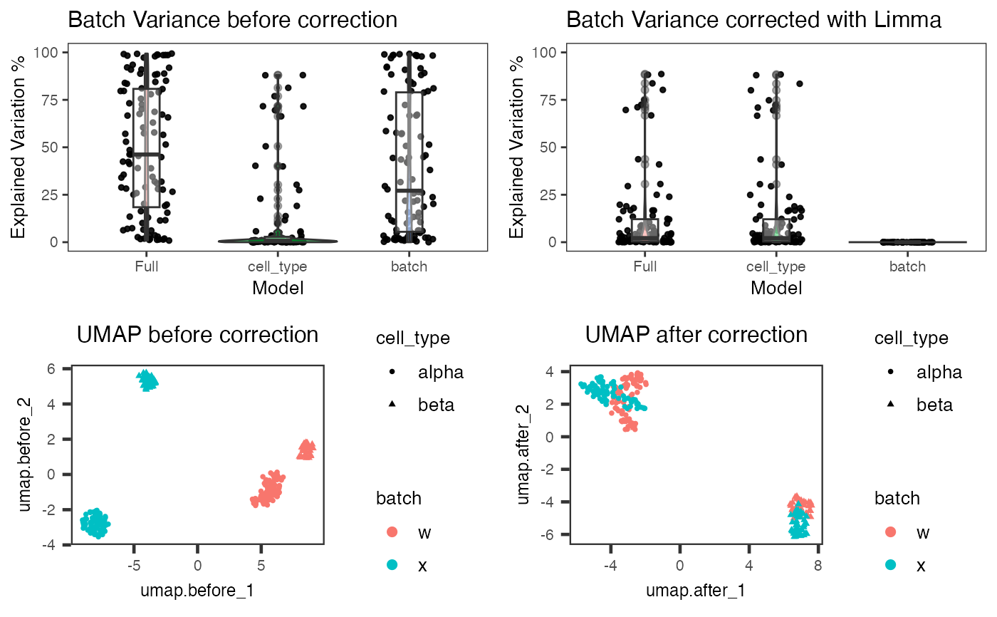 Four plots will be combined. Two of them are violin/box-plots for percent variance explained by the batch variation, and optionally the covariate, for original and corrected. The other two are UMAPs of the original assay and the correction result matrix. If SCTK batch correction methods are performed in advance, this function will automatically detect necessary input. Otherwise, users can also customize the input. Future improvement might include solution to reduce redundant UMAP calculation.
