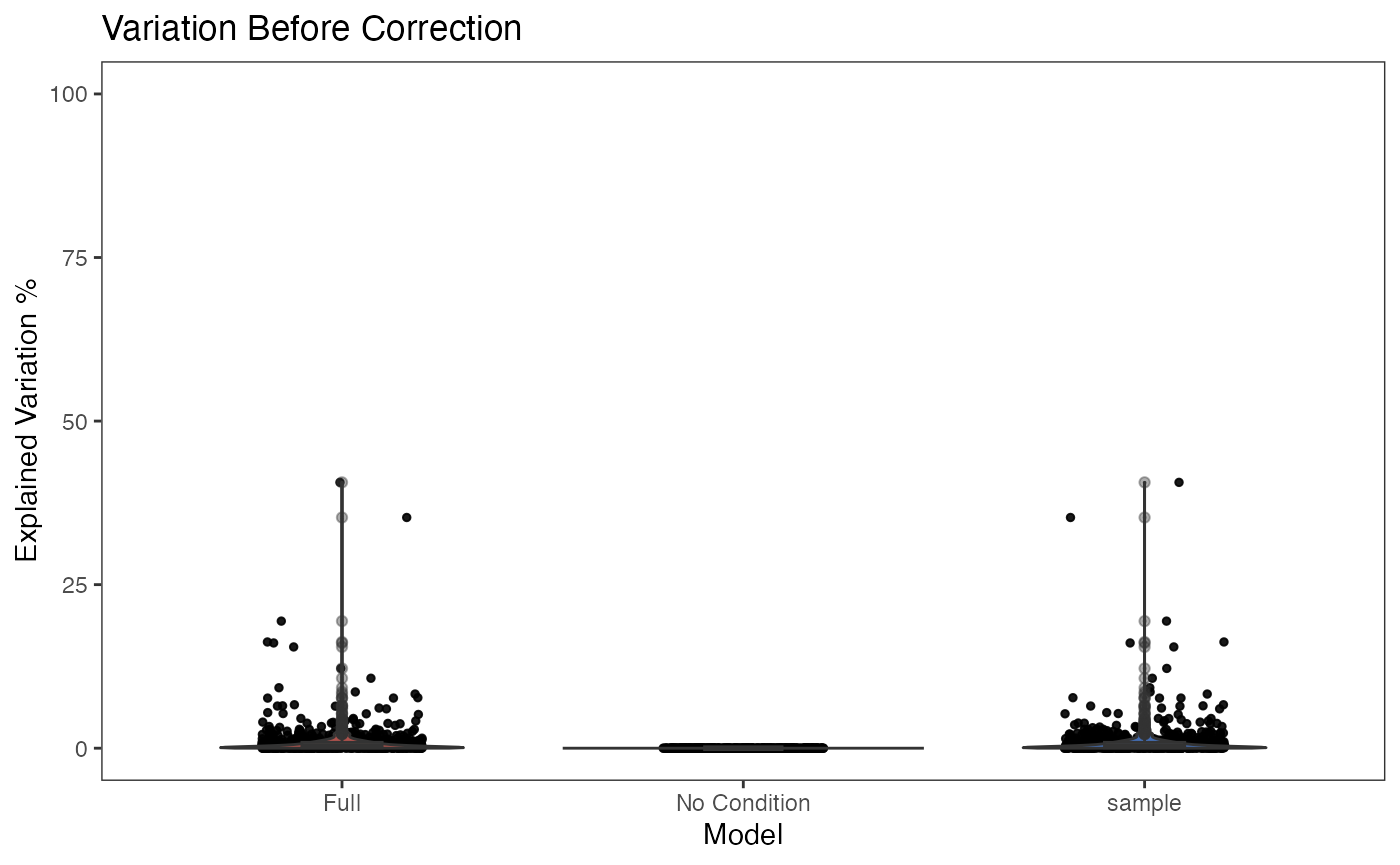 plotBatchVariance(inSCE = sce.small, useAssay = 'logcounts', batch = 'sample', title = 'Variation Before Correction')