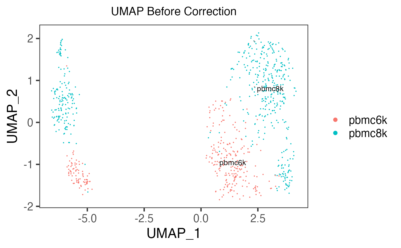 plotSCEDimReduceColData(inSCE = sce.small, colorBy = 'sample', reducedDimName = 'UMAP', title = 'UMAP Before Correction')