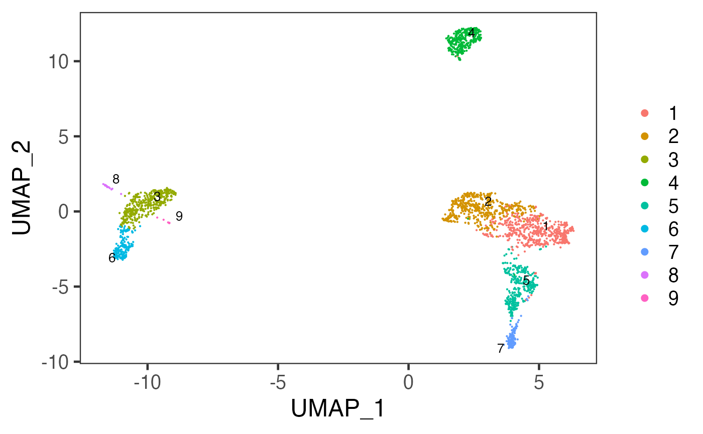 sce <- runUMAP(sce, useReducedDim = "PCA", initialDims = 10, reducedDimName = "UMAP", seed = 12345)And we can visualize the cell populations on the UMAP with cluster labeled.