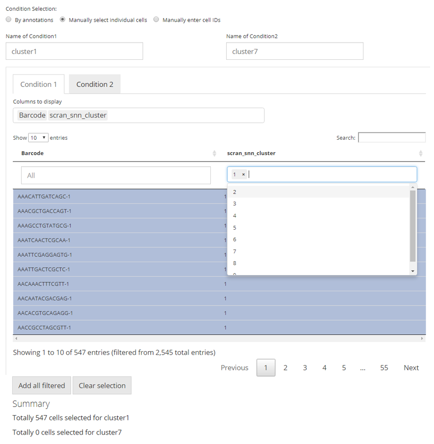 In this approach, we utilize a data table, where filters can be applied, for the flexible definition on each condition. By default, all classes of annotations are displayed. In the selection input “Columns to display”, users can select one or more variables of annotation, which should be displayed and used for filtering. The blank box under each column title is where the filters are applied. For categorical columns, one or more selections on available variables can be made; for numeric columns (with continuous values), value range can be set. All filters applied are not technically making any selection on cells, but adjusting which cells to display in the table. This can be inferred from the first text span summary below the table area. After users applied all necessary filters, click on “Add all filtered” button below the table area to technically make the selection. Meanwhile, each row in the table is clickable to make a single selection/cancellation on cells.
