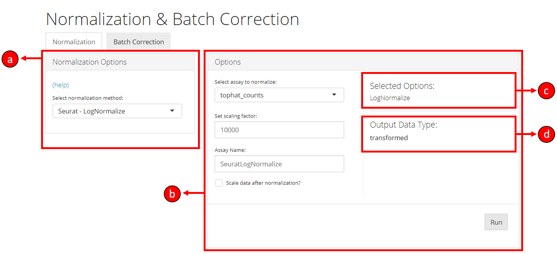 The section a lets you choose a normalization method, whereas the section b allows for various options to be modified and selected for a particular normalization method selected from section a. The section c displays the overall methods/options selected for this instance of normalization process. The section d displays the output data type once the normalization is run. This output data type represents the nature of the data that will be output based on the selected options. For example, output data type maybe transformed if transformation options are selected including normalization methods, or maybe scaled if the scale option is selected. The section c and d update automatically based on normalization method and options selected by the user.