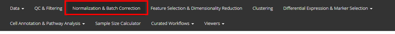 Normalization tab can be opened up by clicking on the Normalization & Batch Correction from the top menu and further selecting the Normalization sub-tab in the subsequent window as shown below.
