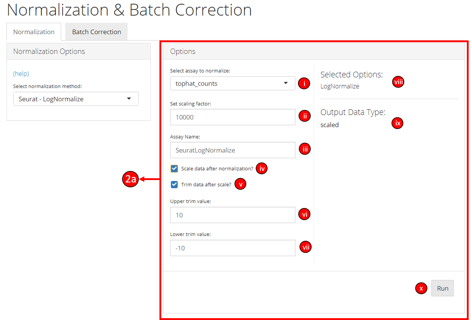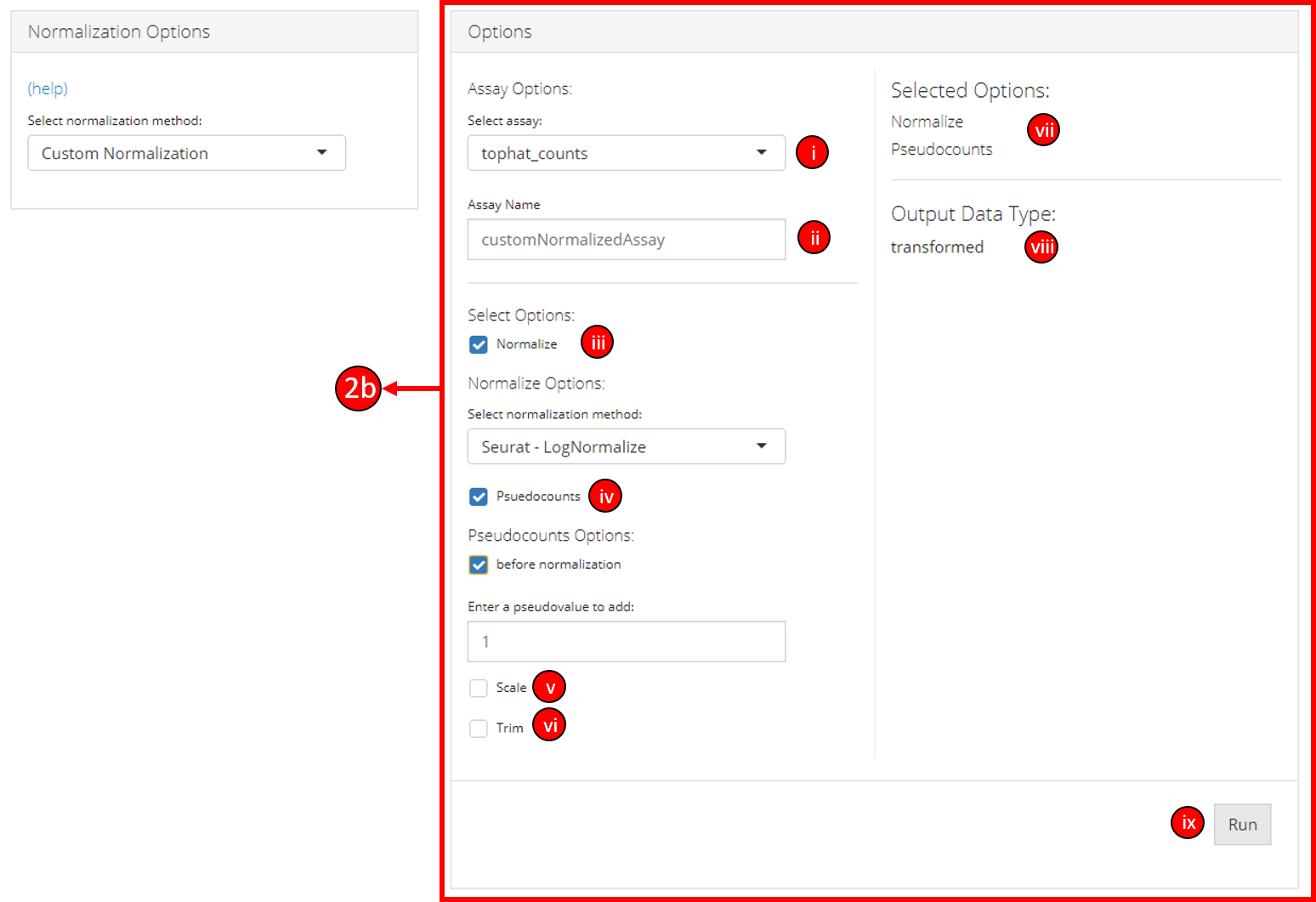i. Select the input data assay to use as an input with selected normalization/transformation options.