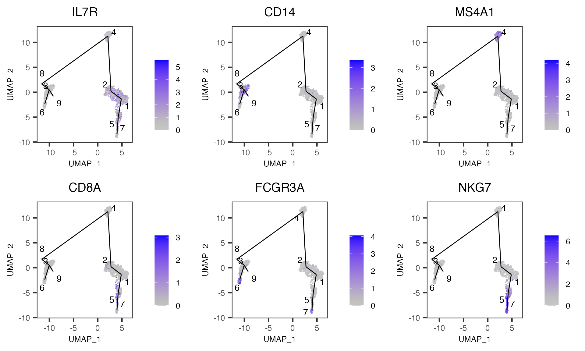 plotTSCANDimReduceFeatures(sce, c("IL7R", "CD14", "MS4A1", "CD8A", "FCGR3A", "NKG7"))