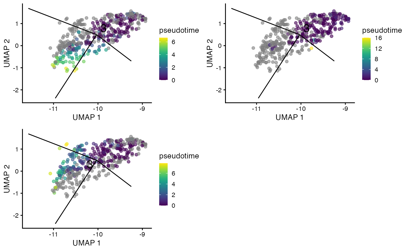 plotTSCANClusterPseudo(sce, useCluster = useCluster, useReducedDim = "UMAP")