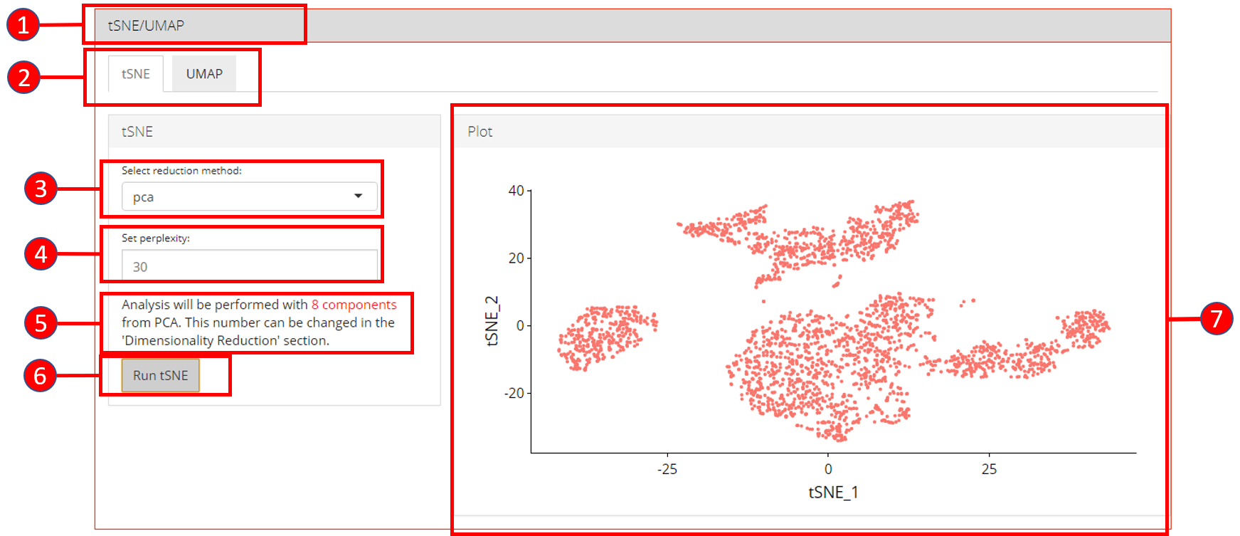 50.TRUE.‘tSNE’ and ‘UMAP’ can be computed and plotted once components are available from ‘Dimensionality Reduction’ tab.
