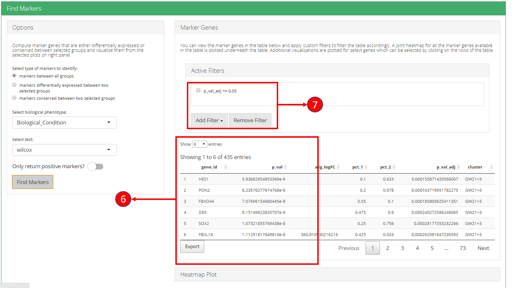 6. Identified marker genes are populated in the table. 7. Filters can be applied on the table.