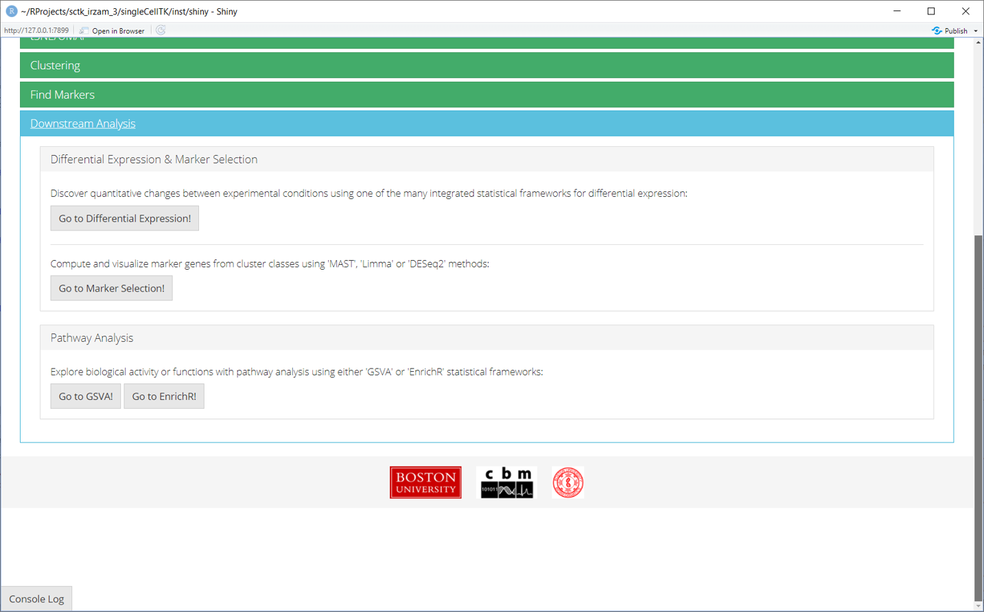 0.8.TRUE.‘Find Markers’ tab can be used to identify and visualize the marker genes using on of the provided visualization methods. The tab offers identification of markers between two selected phenotype groups or between all groups and can be decided at the time of the computation. Furthermore, markers that are conserved between two phenotype groups can also be identified. Visualizations such as Ridge Plot, Violin Plot, Feature Plot and Heatmap Plot can be used to visualize the individual marker genes.
