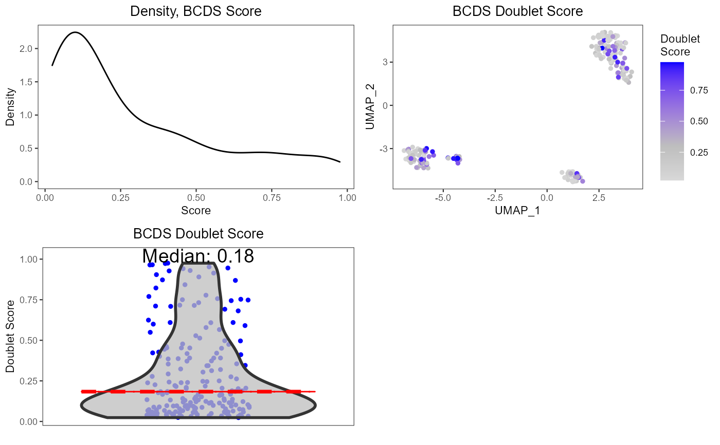 data(scExample, package="singleCellTK") sce <- subsetSCECols(sce, colData = "type != 'EmptyDroplet'") sce <- getUMAP(inSCE=sce, useAssay="counts", reducedDimName="UMAP") sce <- runBcds(sce)#>#> [15:38:58] WARNING: amalgamation/../src/learner.cc:1061: Starting in XGBoost 1.3.0, the default evaluation metric used with the objective 'binary:logistic' was changed from 'error' to 'logloss'. Explicitly set eval_metric if you'd like to restore the old behavior.plotBcdsResults(inSCE=sce, reducedDimName="UMAP")