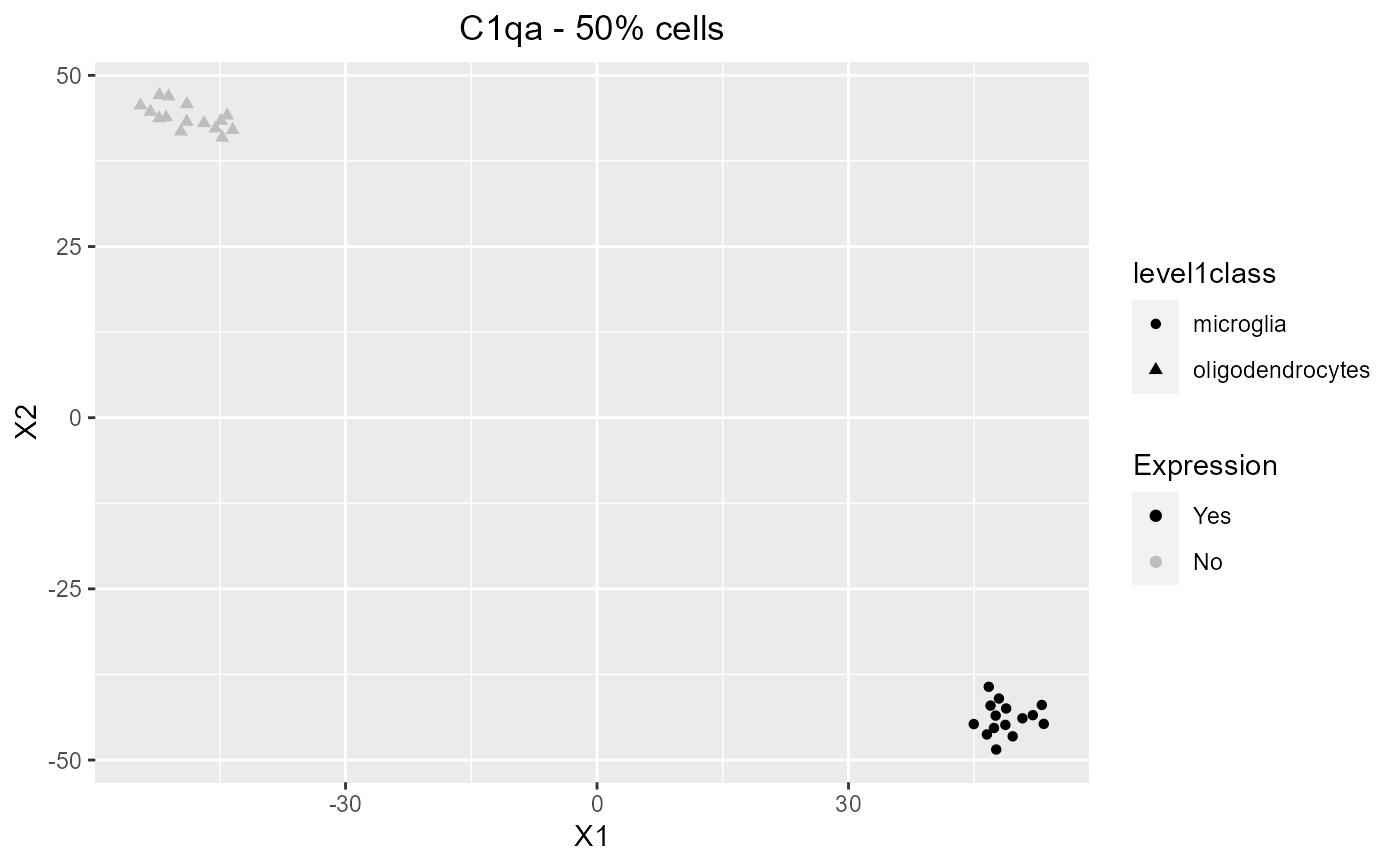 data("mouseBrainSubsetSCE") plotBiomarker(mouseBrainSubsetSCE, gene="C1qa", shape="level1class", reducedDimName="TSNE_counts")